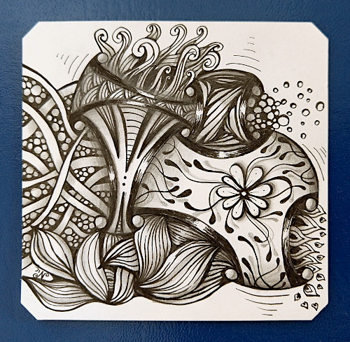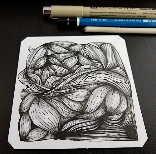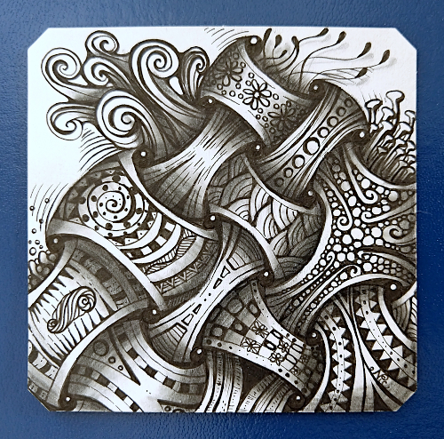 I’ve been able to take some time out the last few days to continue practicing the Zentangle pattern Crazy Huggins. I also took some time out to watch another Eni Oken Art Club video, Elegant Lines, it was another Live session, except I watched the recorded version… combining both classes I came up with these three tiles…