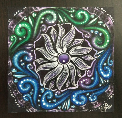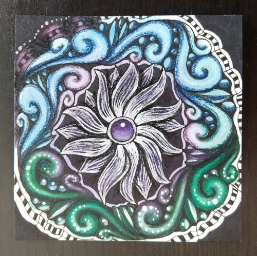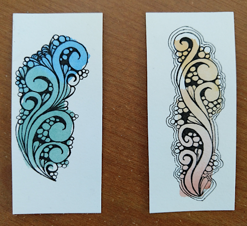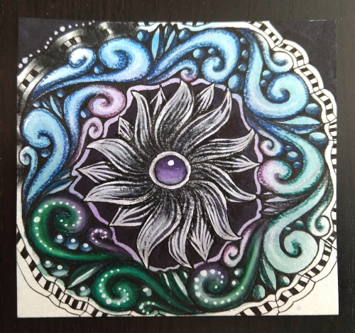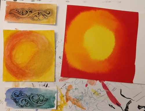 This morning I attended another live online zentangle class with Eni Oken, where we played with the tangle Elegan again, but this time in color. Prior to class we prepped some watercolor paper, then in class we played! 🙂 Here’s how far I got in class…