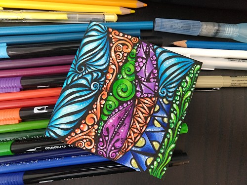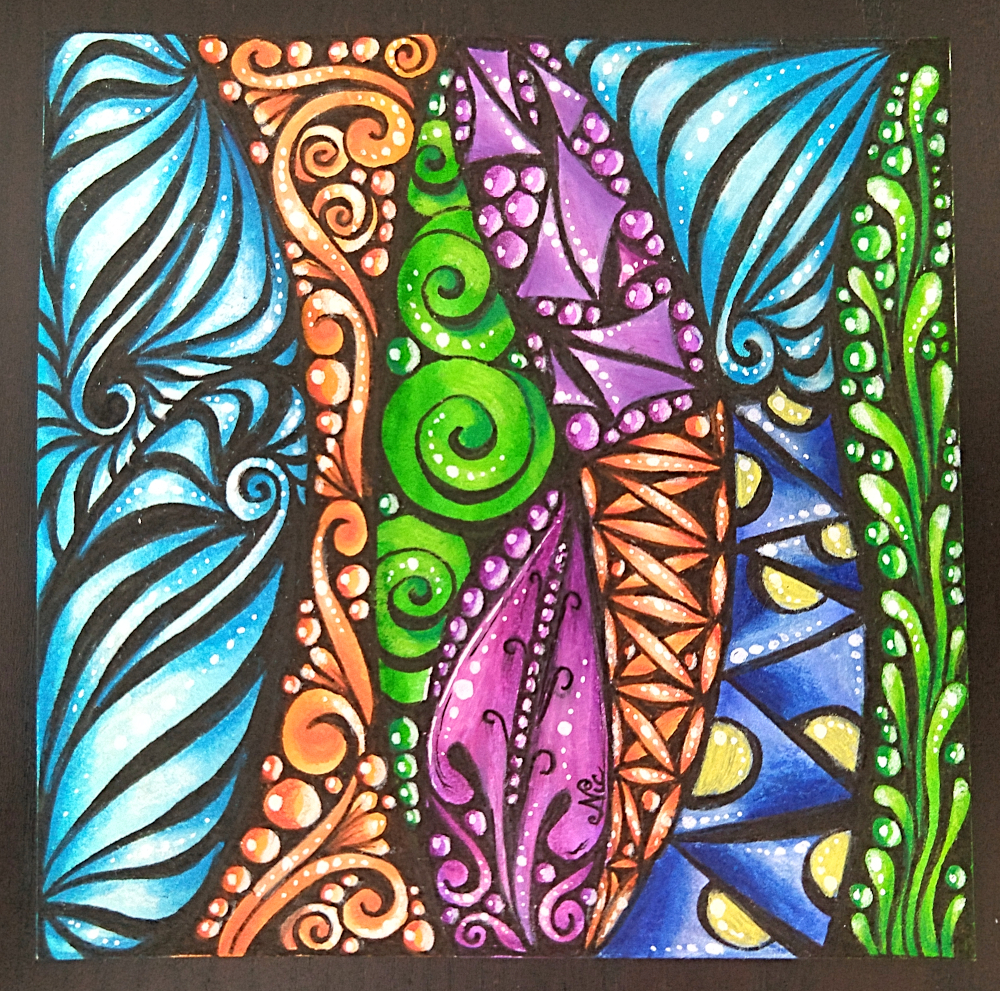 I was able to attend another Eni Oken live online Zentangle class today… it lasted 3 hours! 🙂 We covered Jewel Tones, it was neat to work with such vibrant colors. Here is what I was able to finish in class…