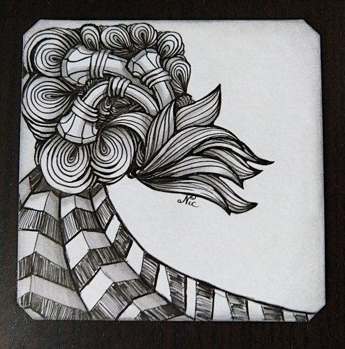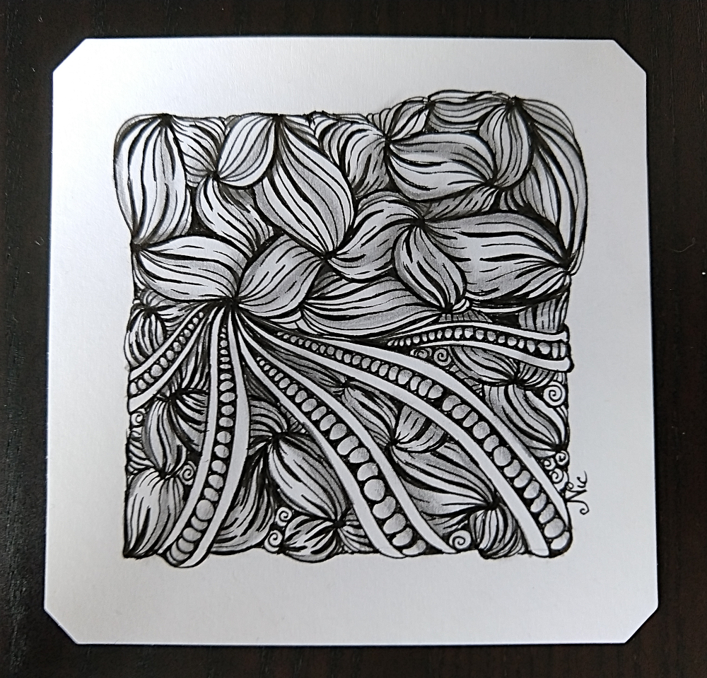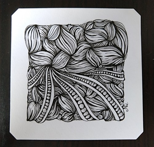 Let’s see… I watched a recording of a live Zentangle class video taught by Eni Oken that I had missed, partly because I don’t have an Apple device and I think Procreate is only for Apple (I could be wrong)… But later I realized that I could watch the tangling part and do it with pen and paper, so that’s what I did…