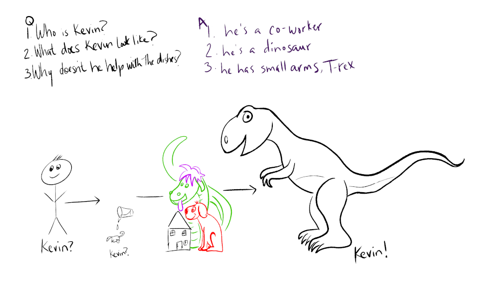 I thought it was cute and started to blame our Kevin (over the last 6 months or so) for not doing the dishes at night. I tried to explain Kevin to my mother-in-law via chat, my husband and I went through various gifs trying to explain what Kevin might look like. I was originally thinking of an add-water sponge brontosaurus that grew too big for the house, like Clifford or Elliot. As I was trying to explain I realized that I actually really like our Kevin and that he was more like a friendly imaginary friend.