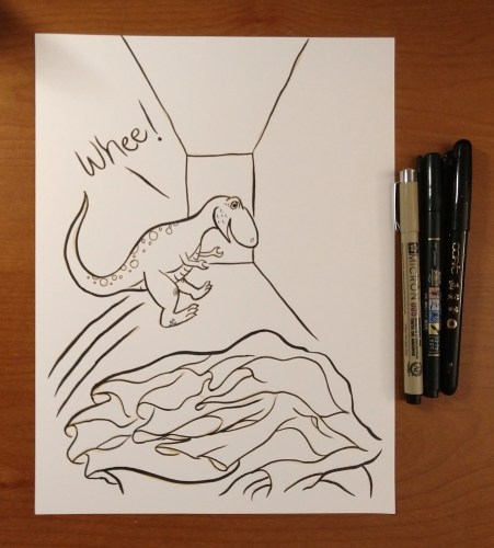 Today I continued to work on the Bulky drawing. I scanned in my inked drawing, then I added a door and a light to the ceiling. Next, I played around more with grey tones. It took ALL day (seriously I worked on this for almost 8 hours!) but I finally came to something I liked. Sometimes it’s frustrating, but I know that mistakes are how you learn, so these hours I’m spending are skills I’m learning… so it’s all good.