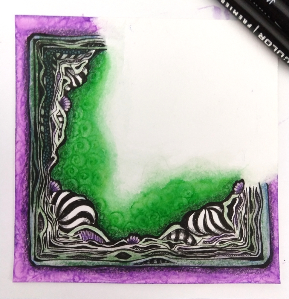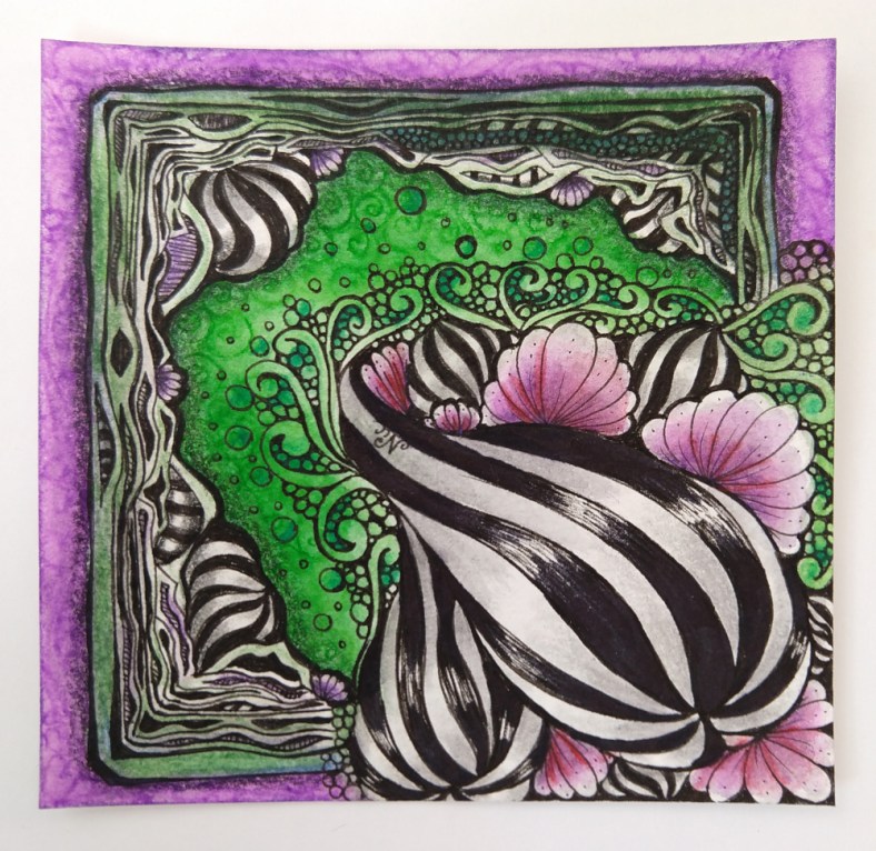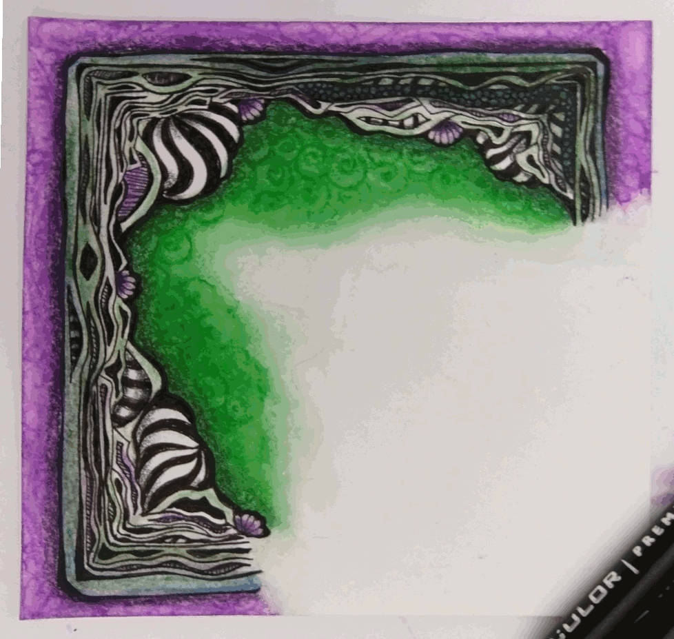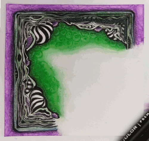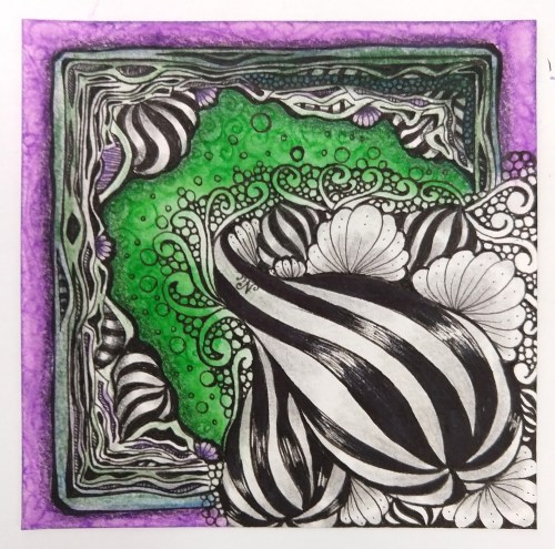 Yesterday, I attended an online zentangle zoom class, Framed & Cornered, with Eni Oken. I didn’t do the homework before class, oops… which was to have a tangle already on the tile to ‘frame’. So I made a blob string up in the corner to tangle in later… I was clearly inspired by her Gourdeous tile, as well as thinking about Halloween (green/purple color scheme) and a bit of Tim Burton. I worked on the Framing portion during class ~2.5 hours…