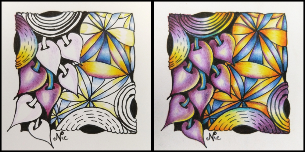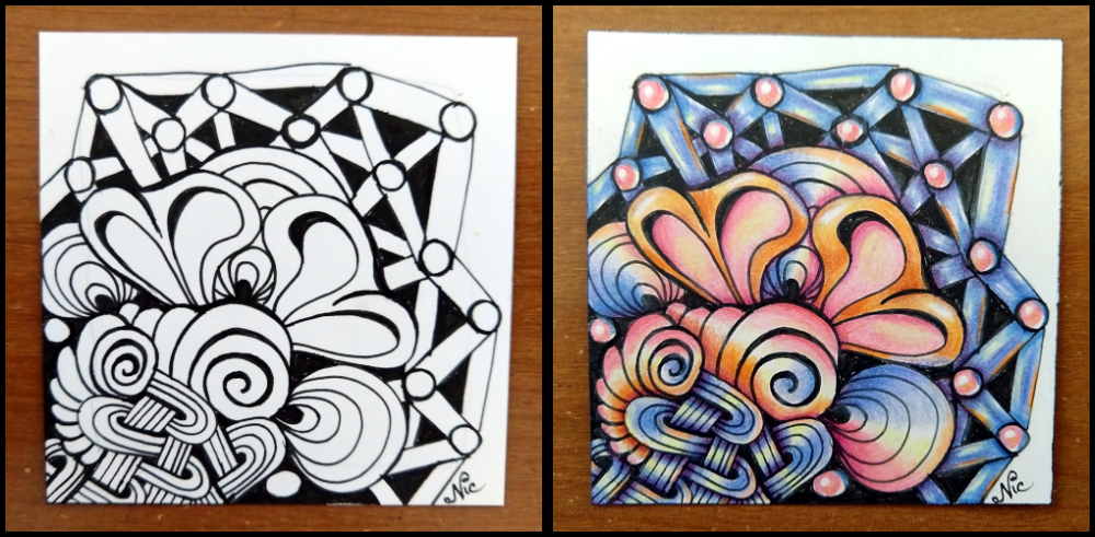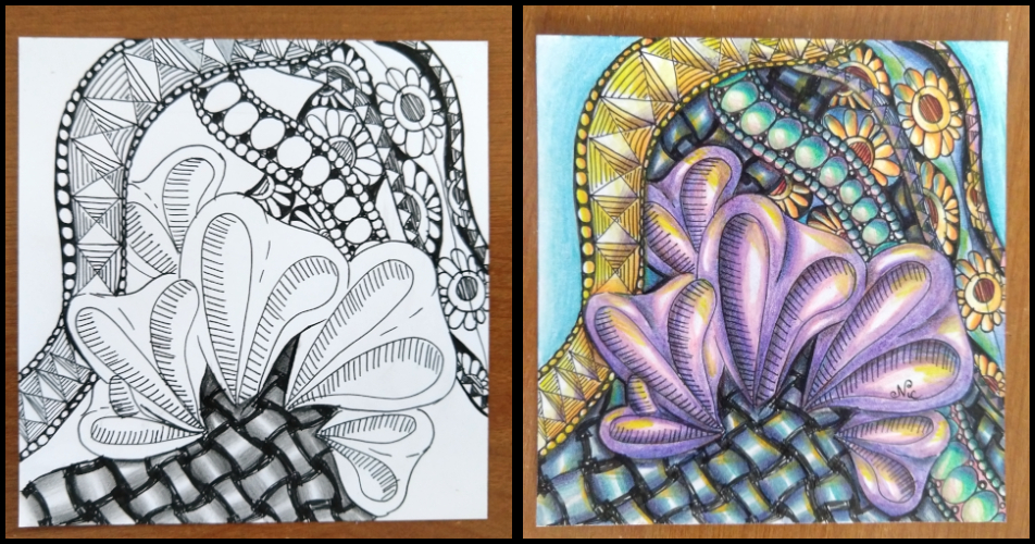Again, I wanted to practice, so I drew the tangles from the above tile and colored them slightly differently…