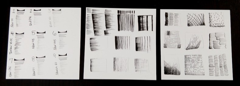 So last Friday, we started working on single-pen hatching. I love the look of hatching, but haven’t found a confidence in my own work. So I’m very happy to get more knowledge and practice on the subject. We made a sampler of our various pens to see how they would make dark, medium, and light marks on our paper so that we could find a suitable pen… then we played around with various hatch marks. That surprisingly took 2 hours!