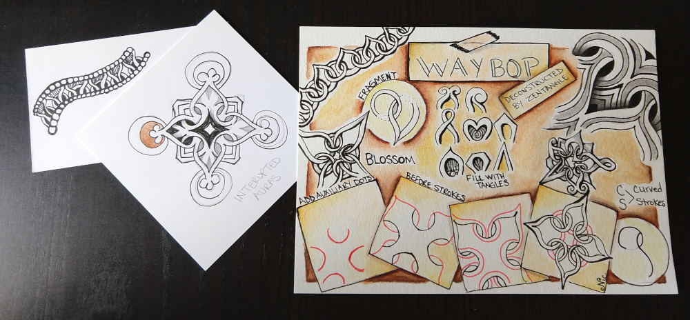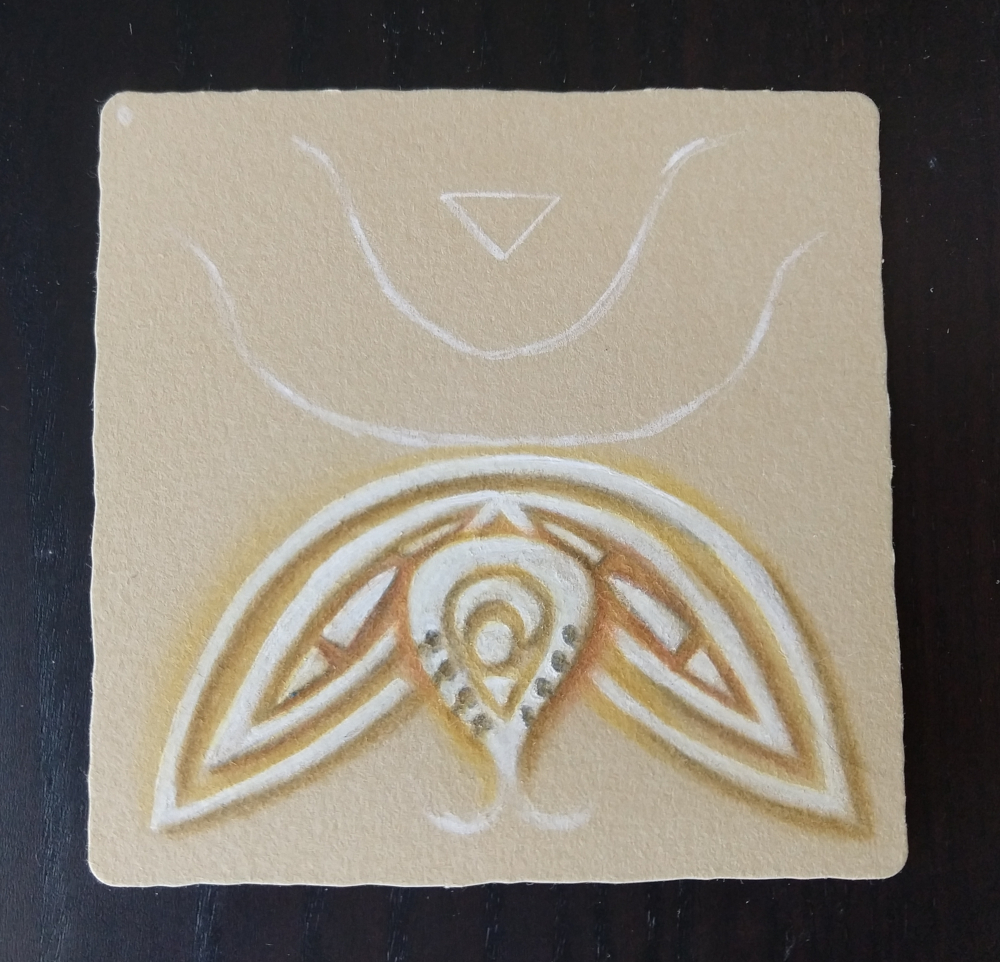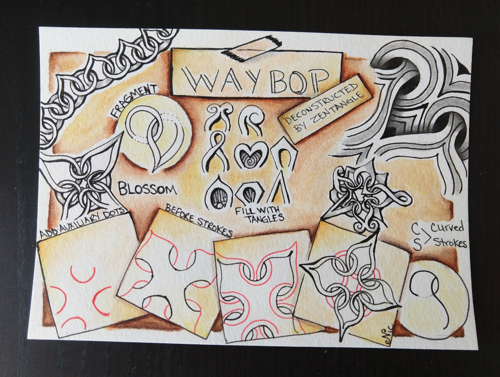 This was a 3-week class (every Friday for about 3 hours), where we explored the zentangle tangle/pattern called Waybop. It’s a tangle that looks like it interlocks and thru brainstorming and collaboration many variances were thought up. I liked several, got a bit behind in class, looked up and realized I misunderstood one of the variances, realized I wouldn’t have a enough space, got overwhelmed and then just watched for the rest of class. I forgot to take a photo of the drawing after class. The next day, I came back to the drawing and worked on it at my own pace…