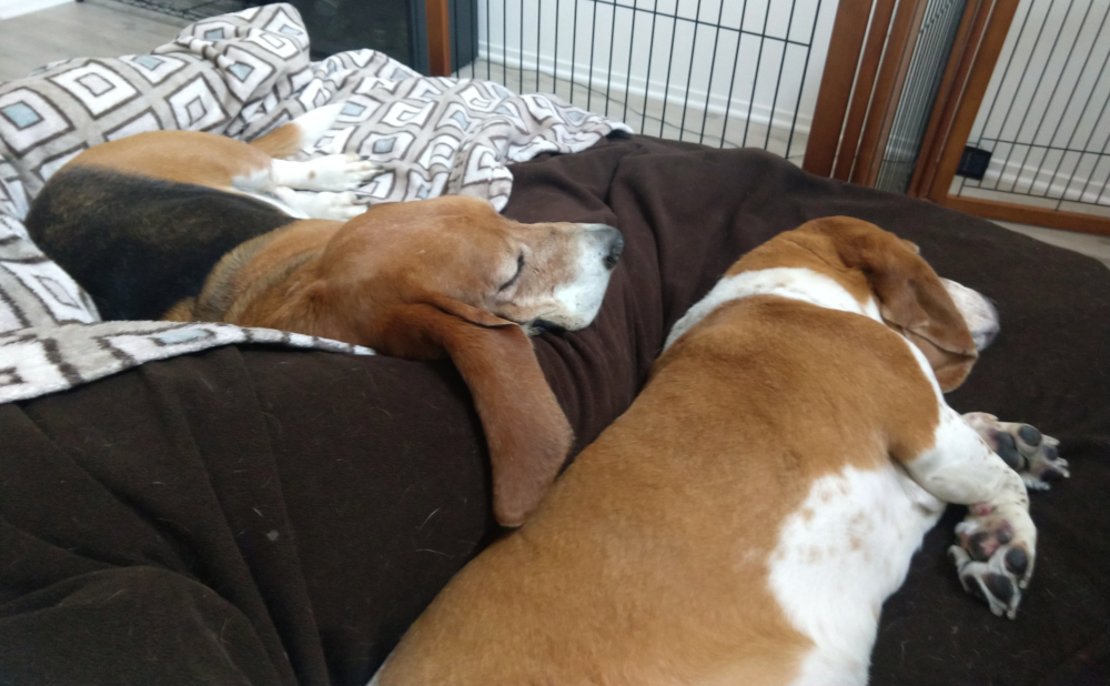 The pups have been enjoying my afternoon naps… see during the daylight, I’ll allow them up on the bed. At bedtime, they have their own beds, and I need room to kick and rotate as I deal with hot flashes and night sweats… but for some reason in the middle of the day, I’m kinda cold, so naps are GREAT! and a warm dog is nice to snuggle with 🙂 At some point, Penny started asking to get up on the bed at sunrise, and being that it was daylight, I’ve allowed it… as well as invited Duke up too. So here’s a snap of this morning, as you can see (me outlined in red, my hubby outlined in blue), it’s a bit tight. I think the pups are requesting a King size bed 🤣😂…