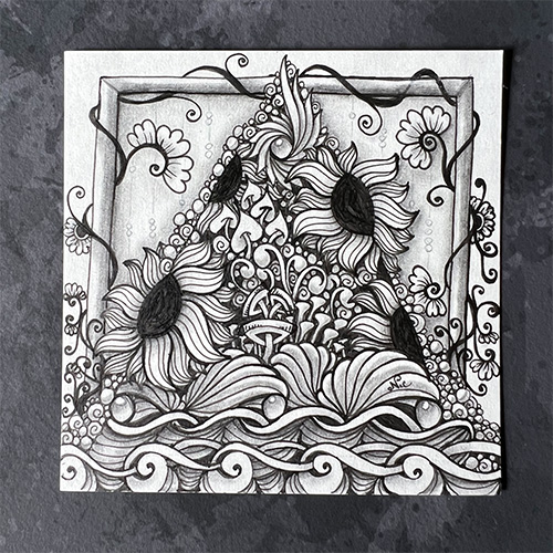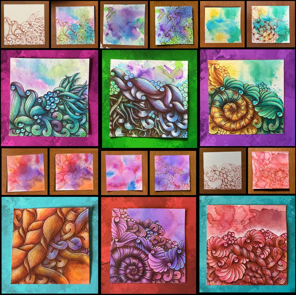 It all started with this lesson to learn how to use watercolor to shade with. My muse loved every moment of it. I drew 6 tiles and shaded them out of order (starting with tile #2, then 4, 1, 6, 3, and lastly 5). And with each tile I learned a bit more, experimented a bit more, and had a blast.