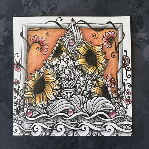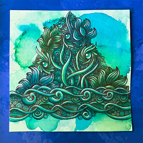 Then I took a watercolor background and drew the tangles from that class and suddenly I saw Cthulhu… and my muse ran with it…