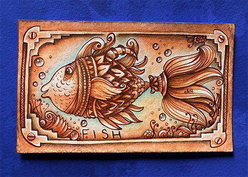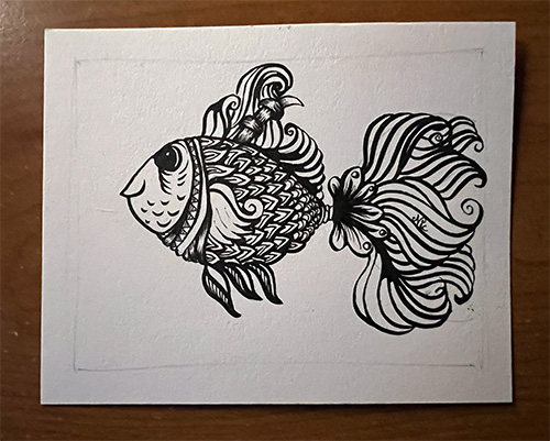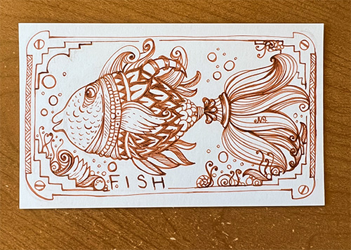 These fish are similar to a recent lesson where we drew fish with Zentangle tangles, my muse was really happy, especially when we then colored/shaded with watercolor.