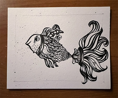 For the first day of Inktober, I wanted to test out my old dip ink from previous Intobers, the one on the Left was done with a much older ink, and it was a little too thick, and I had a lot of trouble with it, including a few accidental splatters… I think the determined face of the fish is reflective of my determination to draw that fish. The one on the Right, was done with a different brand that wasn’t as old, but took much longer to dry. Both are done on Arnhem 100% Cotton paper.