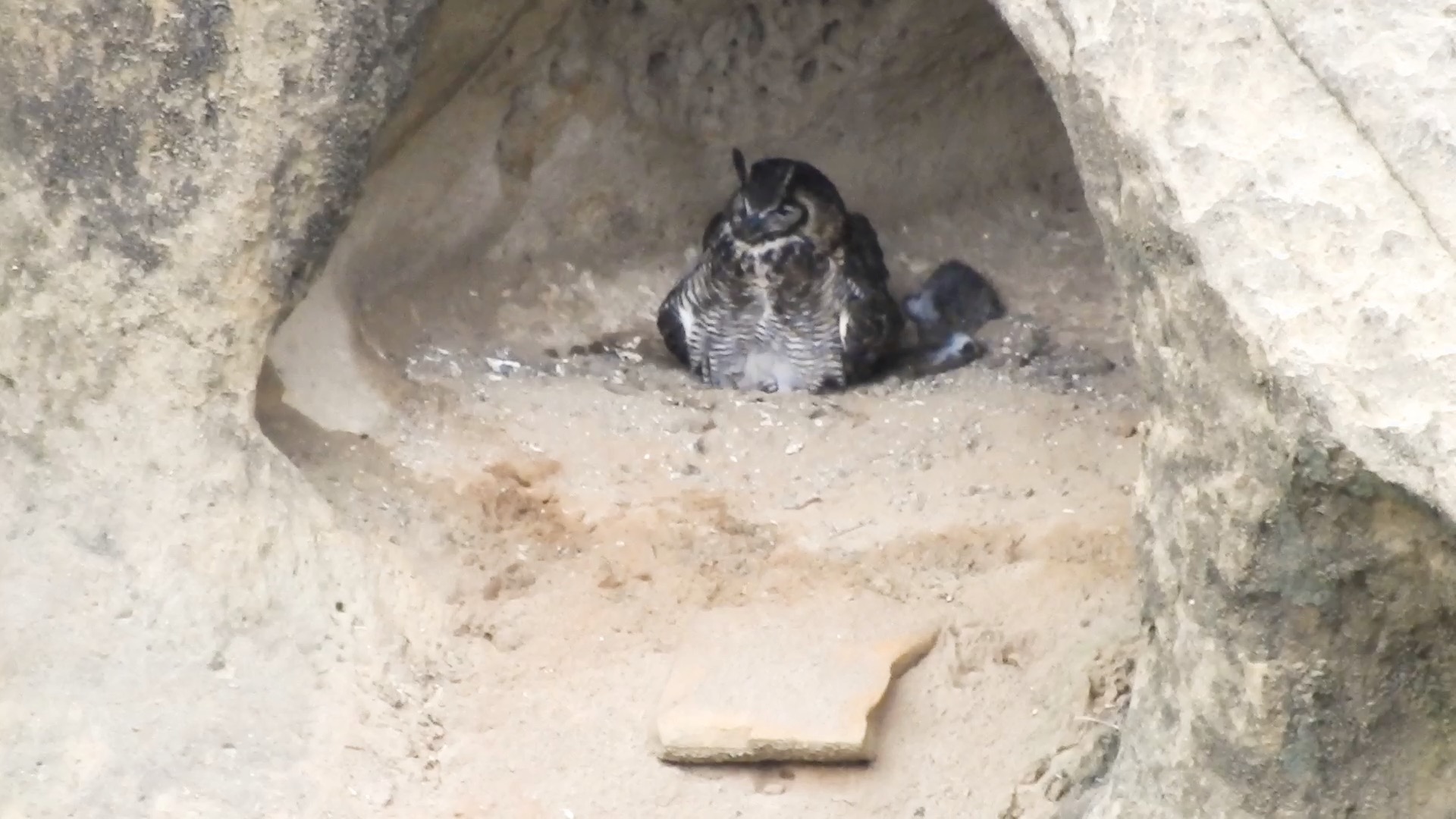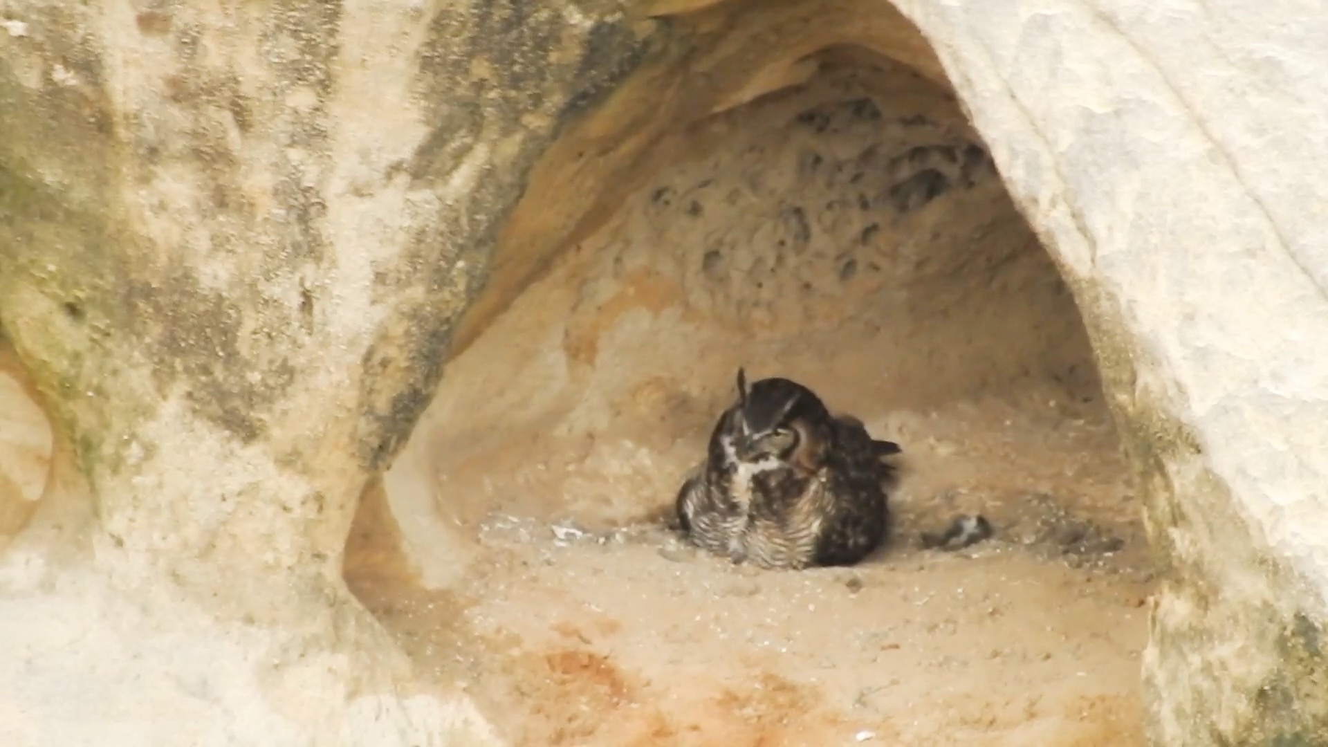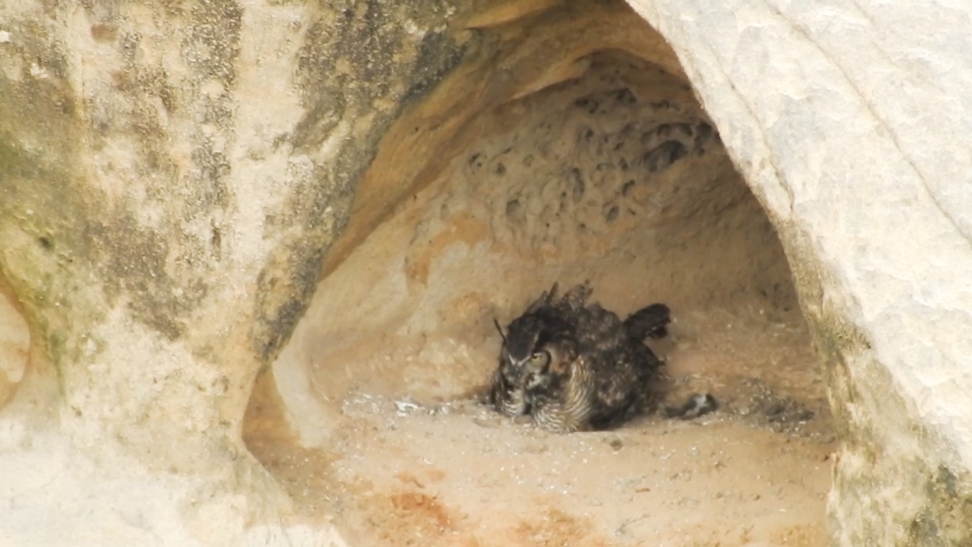 My last post was a test to see if I could upload video… yep I can. So now I thought I’d show you some of the photos and videos I’ve gotten this week and a half, most are before I could really make out the owlets. It all started when one of my neighbors told me that they could see a bobcat in the little cave across the way and that if I got some binoculars I could see it too. I, of course, tried to take a photo with my camera phone… but the cave was too far away to make out anything.