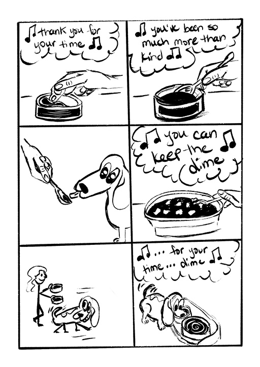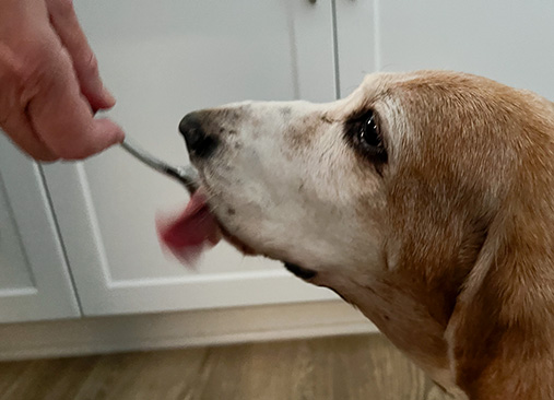 Penny likes to help me in the kitchen, so she is often rewarded with bits of produce she likes (see Fruit Pirate) or in the case of doggie breakfast, she gets to lick the spoon…