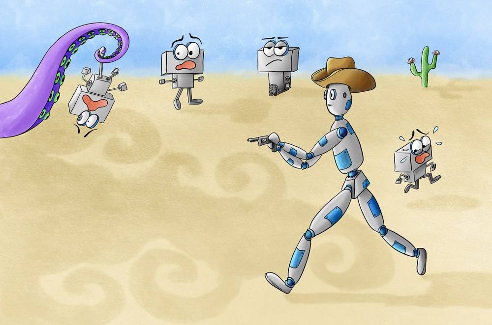 So I changed the gun to a bucket of fish… and somehow it changed the unknown monster to just hungry and throwing a tantrum… which I think is not only better, but is now funnier and silly — which is what I prefer.