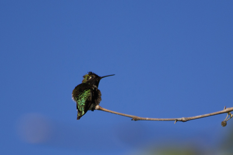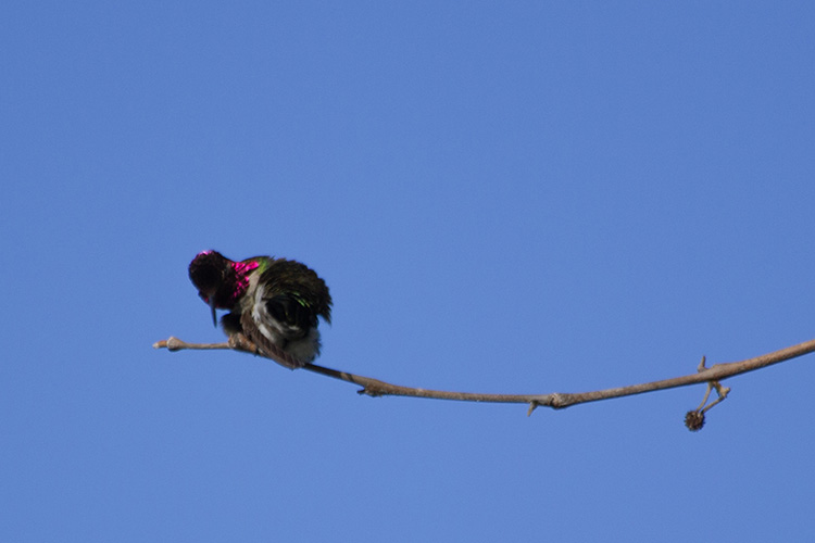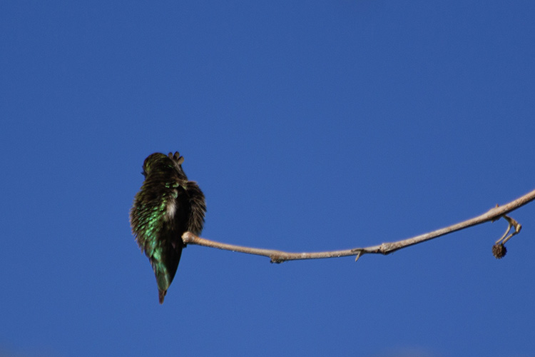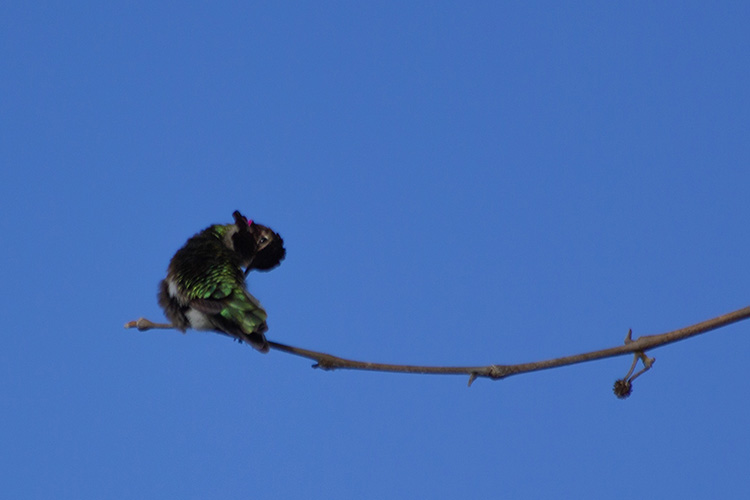 I was watching this Hummingbird wiggle about on their favorite branch (I’ve been fortunate to see this little one on this branch over several days now) and I was thinking, wow this bird really feels comfortable enough to preen while I’m photographing it. I had a hummingbird feeder on my balcony for years and I didn’t get to see them preen… I guess because they were always dive-bombing each other to get to the big red flower. Anyway, I thought it was interesting. And when I got home and could see the images on a much larger screen, I found it even more interesting…