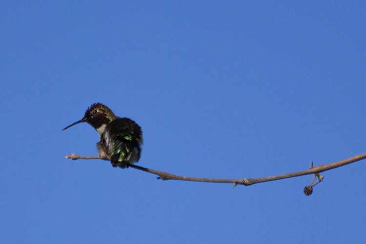 1 – I’m pretty sure this is a male Anna’s Hummingbird, due to the mask on his face that looks black unless the light hits it just right and then it looks red. Female Anna’s Hummingbirds do not have this mask.