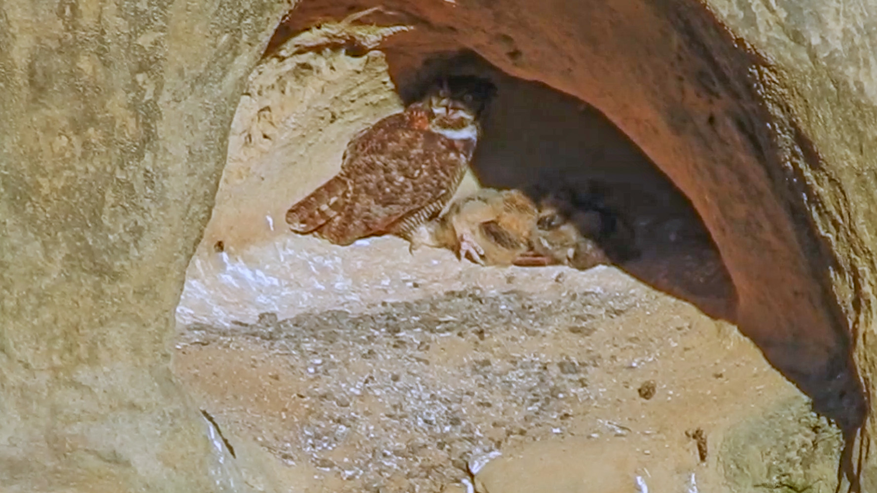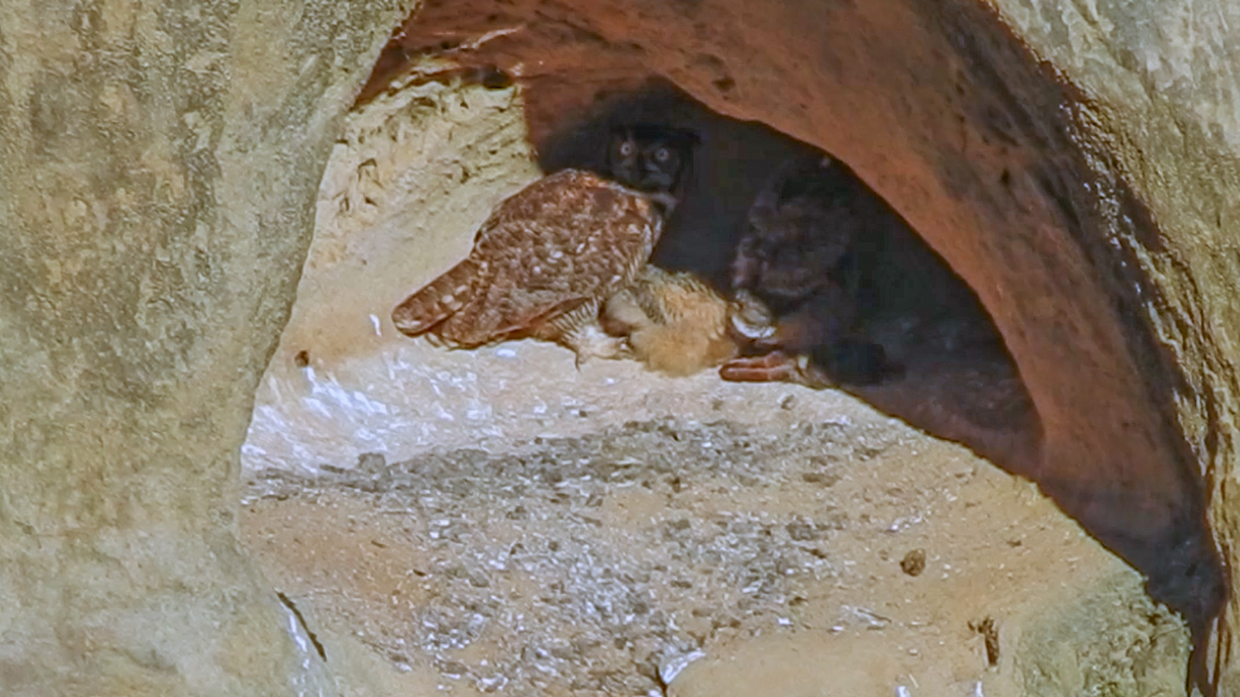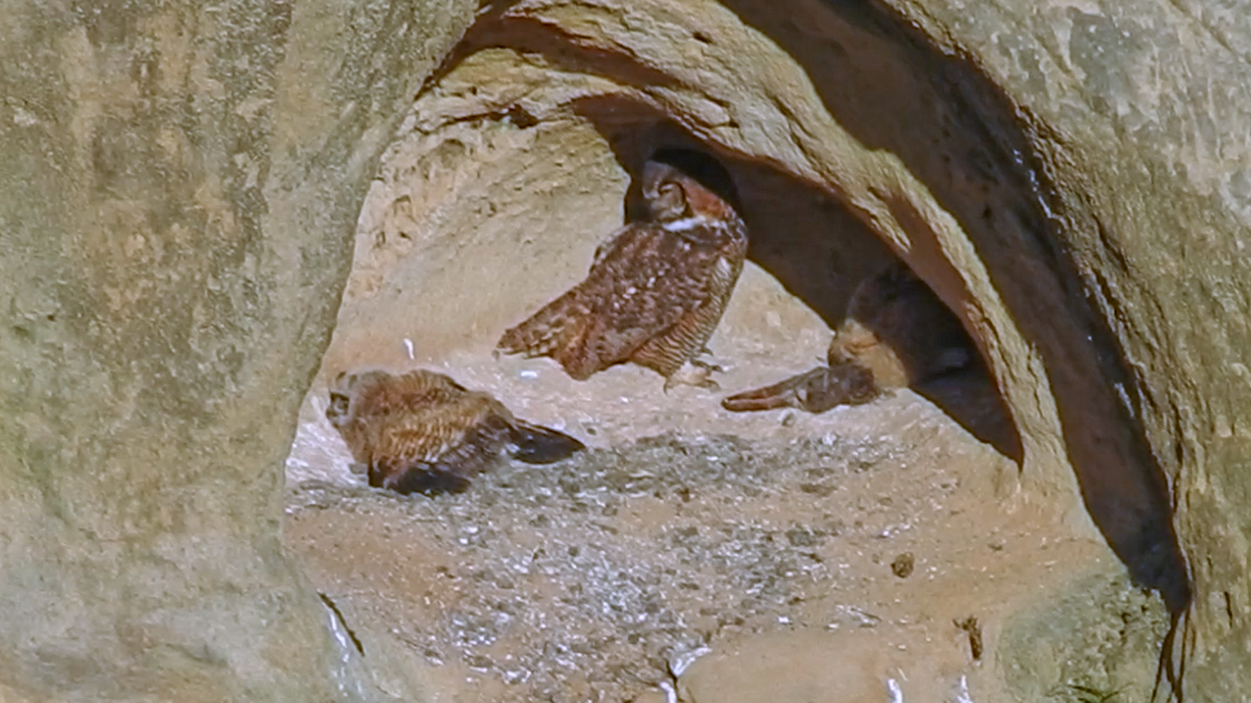 That said, I’ve created a little video of March 19, 2024 for us to enjoy. At first, I was a little disappointed that my footage wasn’t that interesting. But then I realized that it had some things in it that seem odd to me for birds to do… namely, lay down flat. I had a Cockatiel in college, and she never laid down to sleep. And whenever we see Mama Owl napping she too is standing… yet, this little Owlet lays flat on the ground, and in one instance even kicks a foot out… so I put that in the video. And I think that Mama Owl and the Owlet are hot and panting? I need to do some research, do owls pant to get cool?