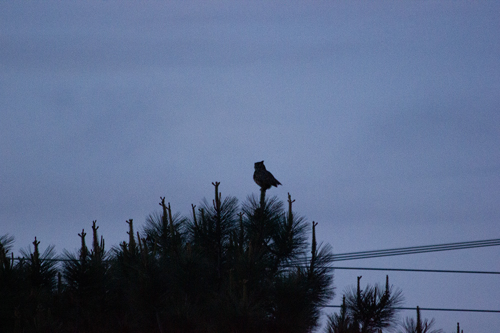 Around 7:18 pm, I started to pack up my gear, and then we heard hooting… we looked around hoping to see the parents… eventually we saw a bird in flight, and then they landed on top of a tree!! I was able capture this on my other camera… Is it the male or the female? I don’t know… but they hooted and flew away and it felt like a great way to end Birbuary.