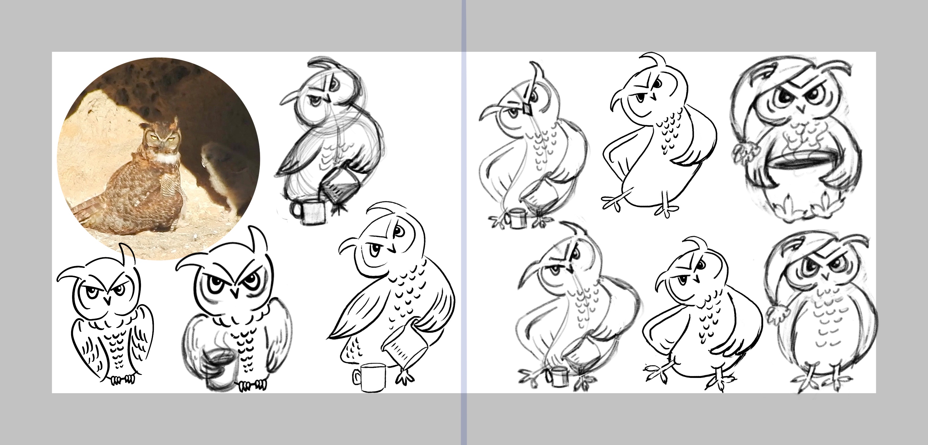Anyway… I guess today is more of a behind the scenes thing… I’m struggling with ‘what do I really want to say visually’. I got a big kick out of the dirty looks the owl was giving me when I was photographing her, but I also want my drawing to be cute. I’m still very much in the indecision stage…