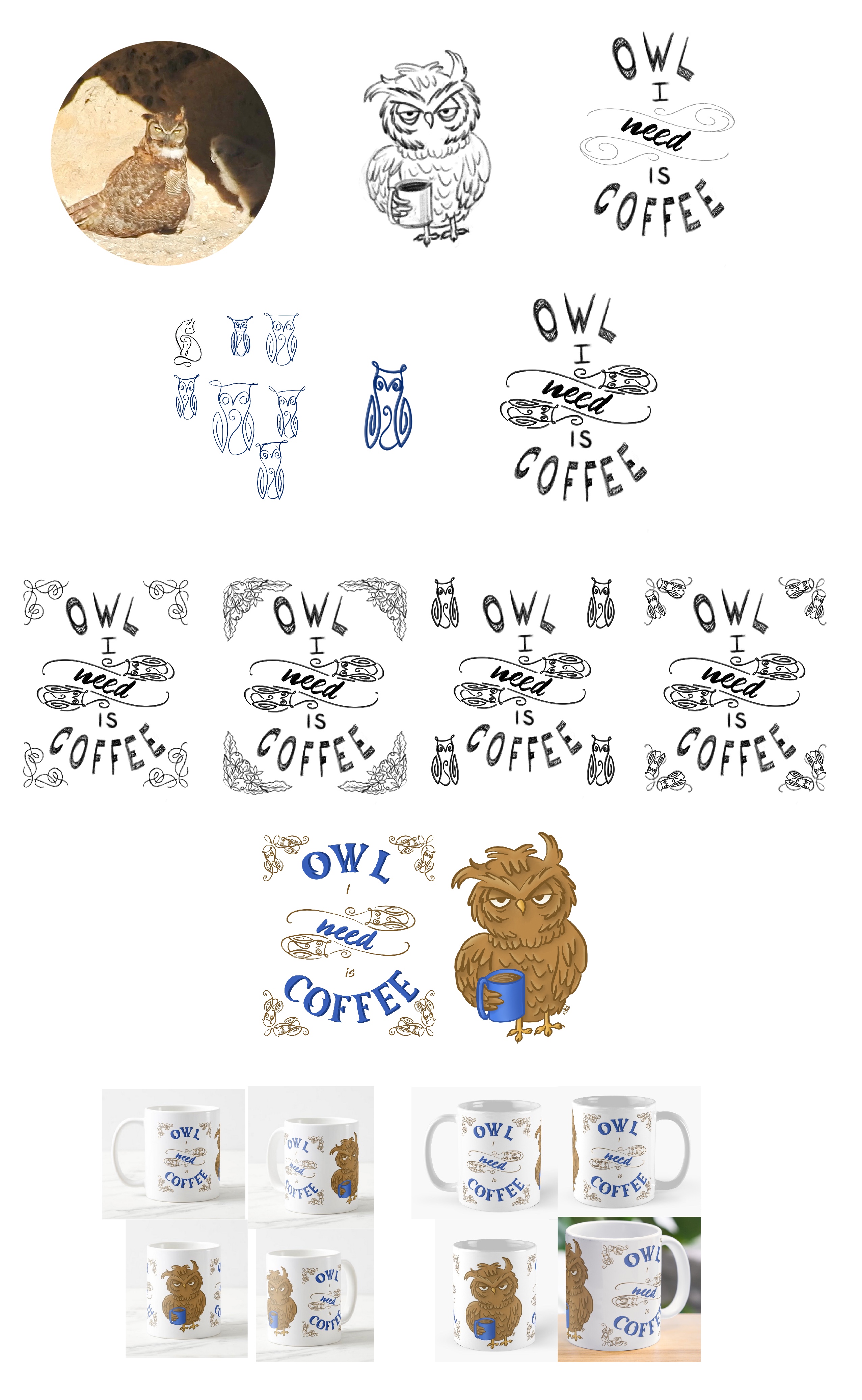 As many of you know, for the past few weeks (one, two) I’ve been working out what I want for a coffee owl mug. I continued to work on several ideas over this past week and finally came to something I liked.