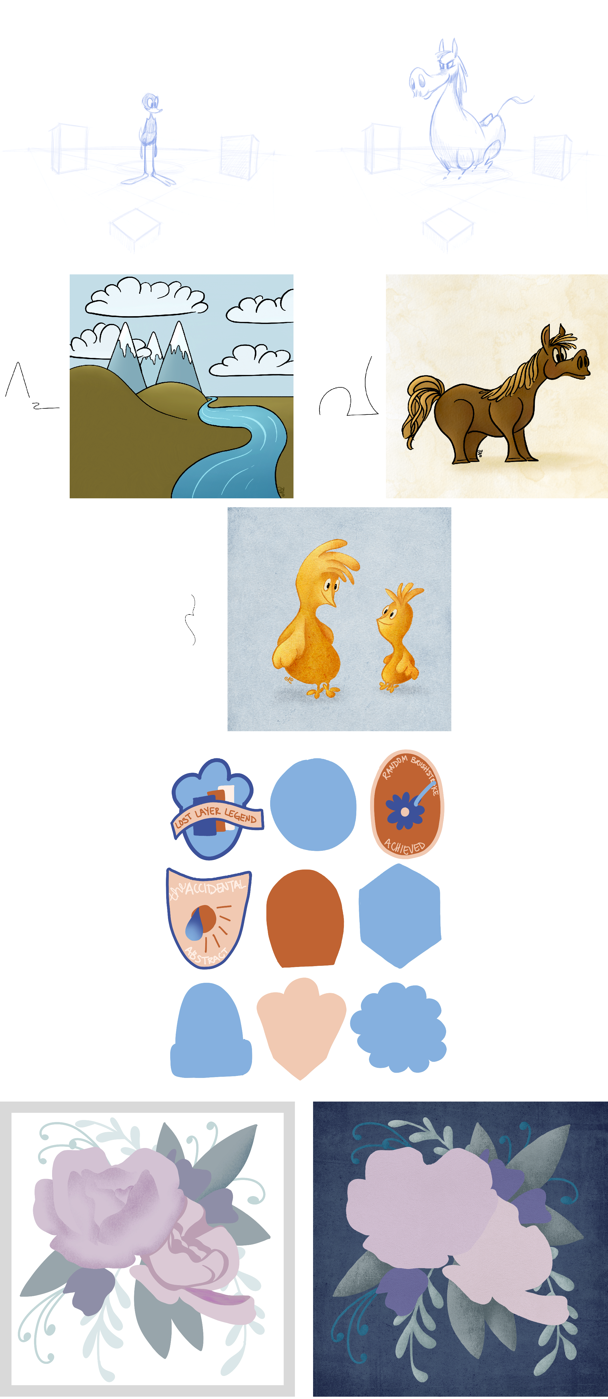 For Procreate Bootcamp, we were given these three lines to come up with something… I came up with a mountain/river view, a horse, and two chicks. I think the horse was greatly influence by the Drawing Animals with Human Personalities class.
