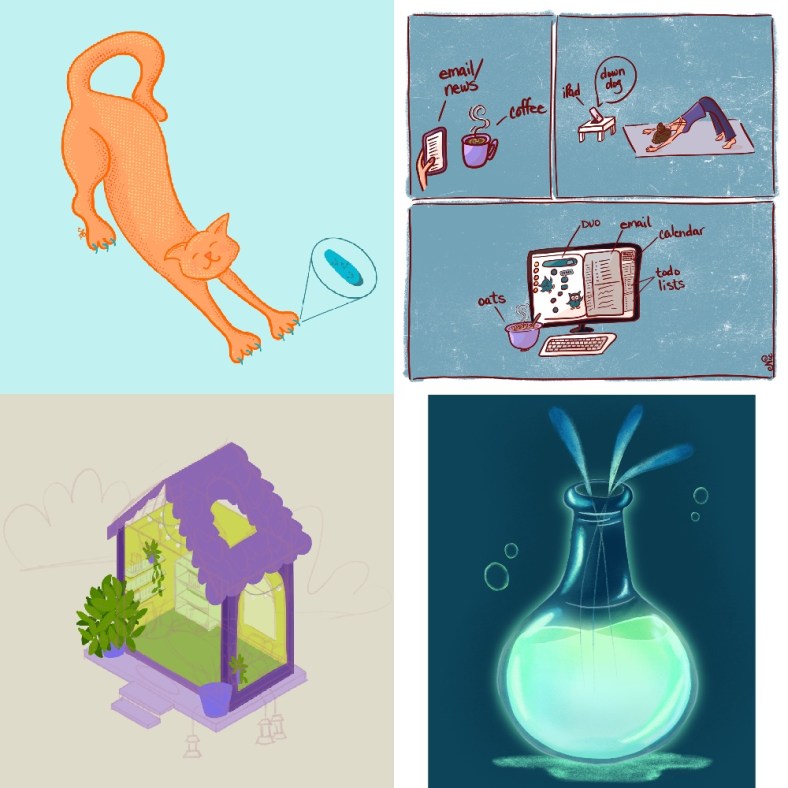 The first two are from Procreate Bootcamp prompts, and the last two are from Procreate Bootcamp Workshops (2hrs Live on a Saturday).