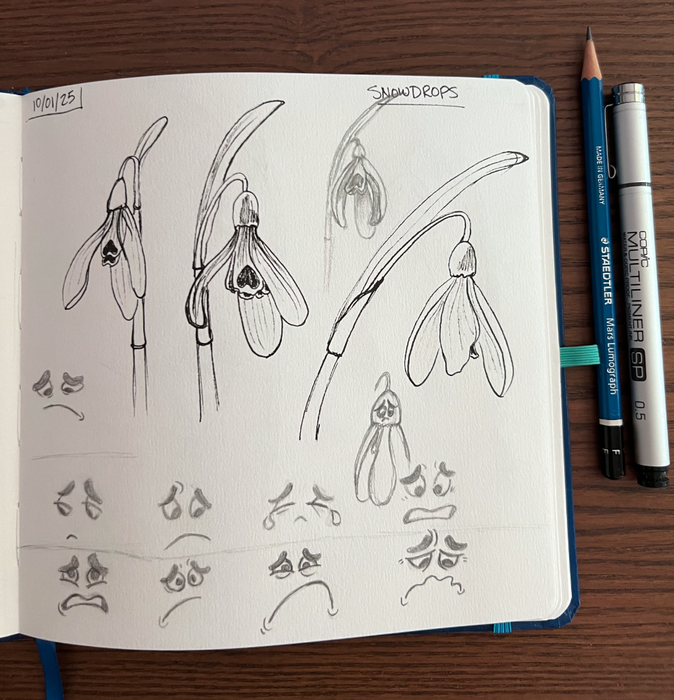 I got the expression ideas from How to Draw Expressive Faces & Hands – Masters of Anatomy. And I used the Snowdrop reference photo by Rob Pumphrey on Unsplash…