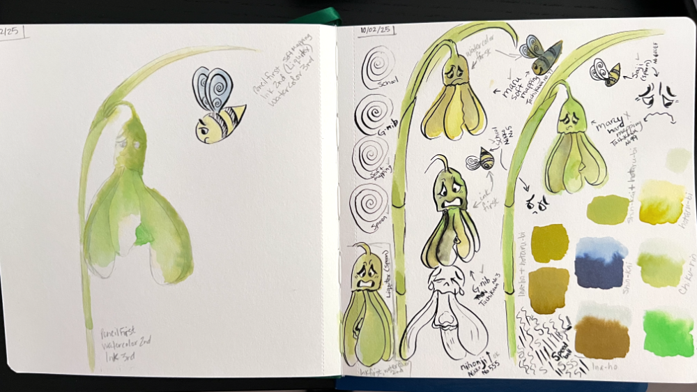 I was surprised when the Speedball Ink reacted to the water, I thought it was waterproof, perhaps it wasn’t completely dry yet. That set me on a set of experiments where I took pencil, watercolor, and ink and tried them out in different orders. I think I like pencil first, then ink, then watercolor… but I’m not sure yet.