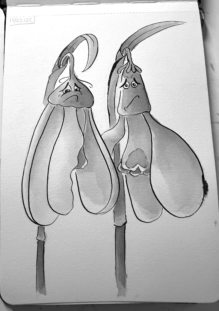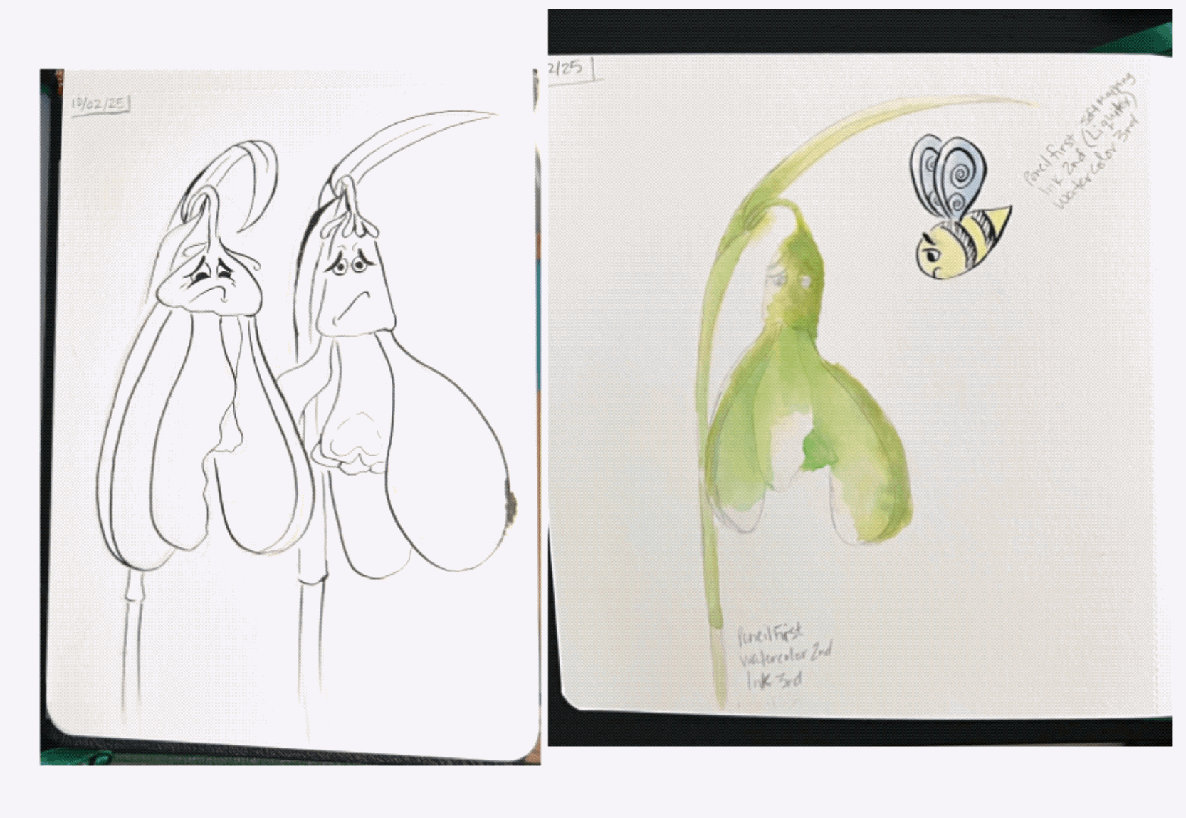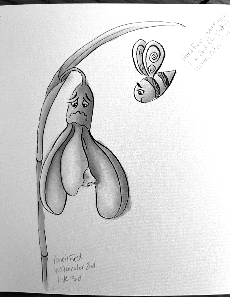 So last night after I ate I added more inking and watercolor to the two Snowdrop projects, then let it dry overnight…