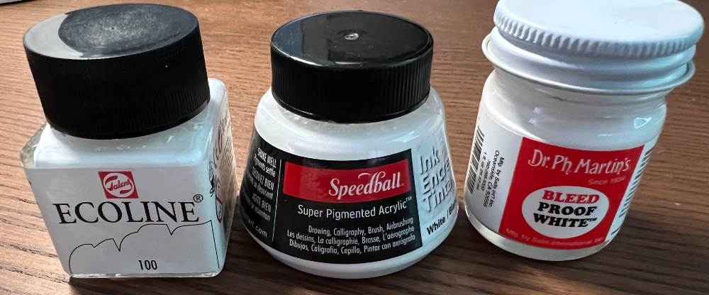 Next I wanted to play with highlights, I have three kinds of white… but couldn’t remember which one I liked so I tested them all… (*note: it wasn’t a fair test of the Ecoline because I had blue in my brush, apparently)…