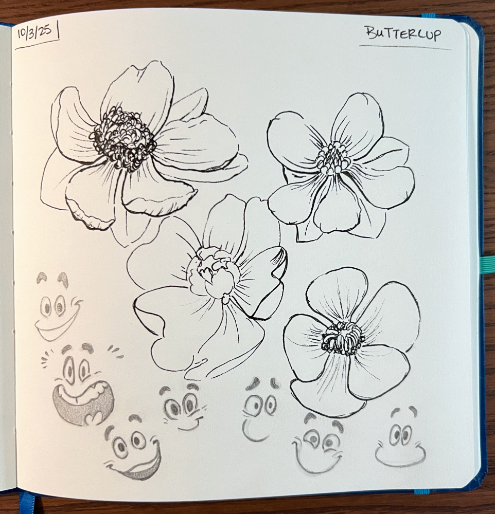 So in case you missed it, I’m working on Bloomtober and trying to add expressions… today I’m working on Buttercup and happy… I did some preliminary drawings yesterday…