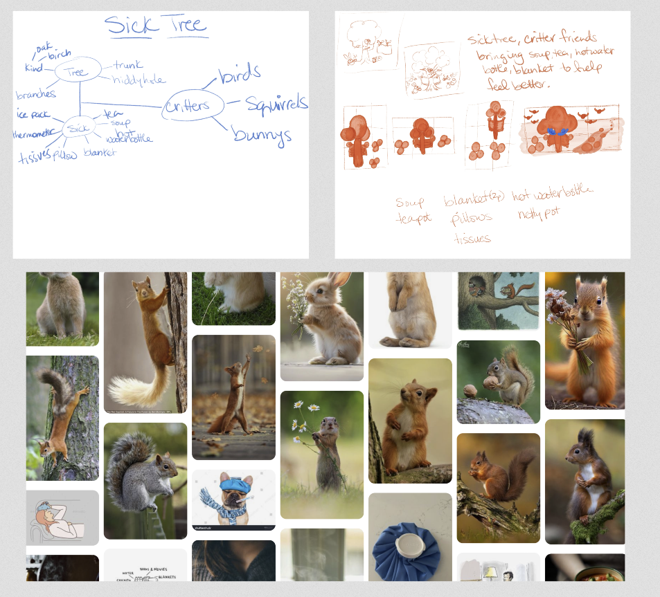 The idea for sick tree was this: “I thought it would be cute to have the woodland animals bring the sick tree all the things you’d bring a sick friend, like tissues, soup, a blanket, flowers, a card, etc.”