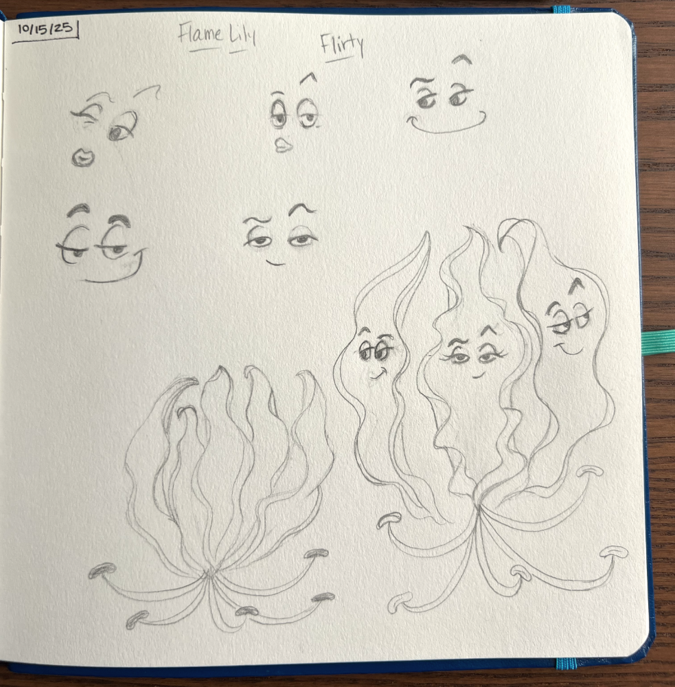 Since I’m waiting for the masking fluid to arrive, I went ahead and started the sketches for the next Bloomtober prompt… Flame Lily. And since the flower looks like flowy dancers to me, I decided to make the expression… flirty.