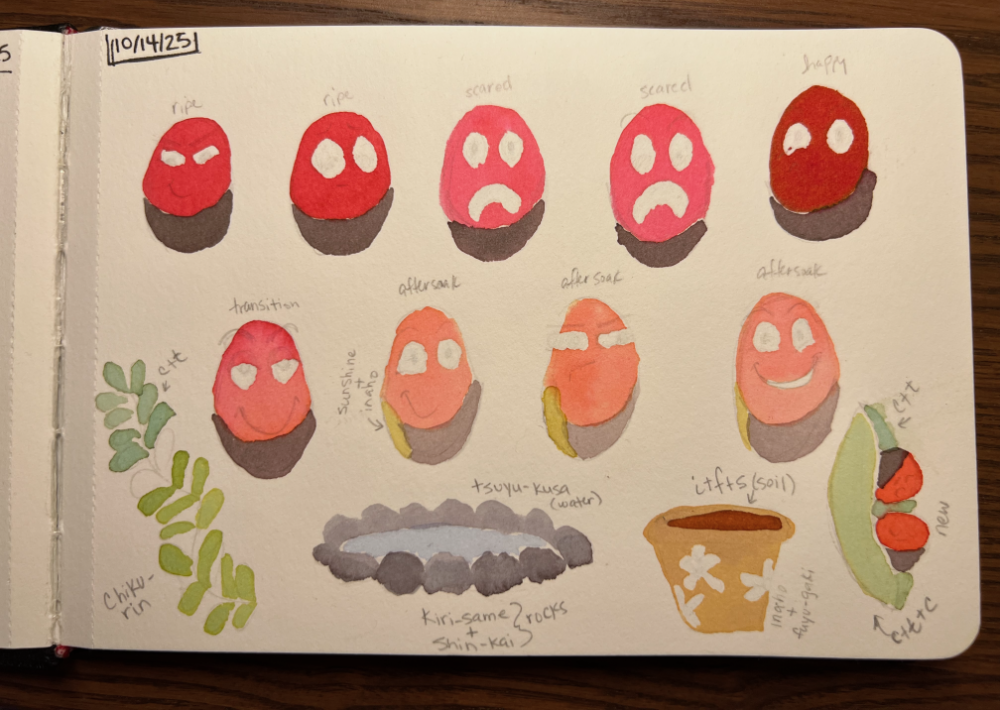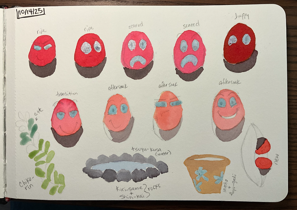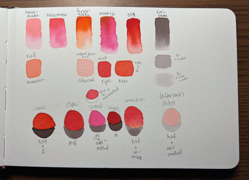 I was able to play around with some color choices and the masking fluid… (note to self: don’t make the swatch page under the current painting page… it’s hard to look at your notes when you have to lift a wet page. 😛 )