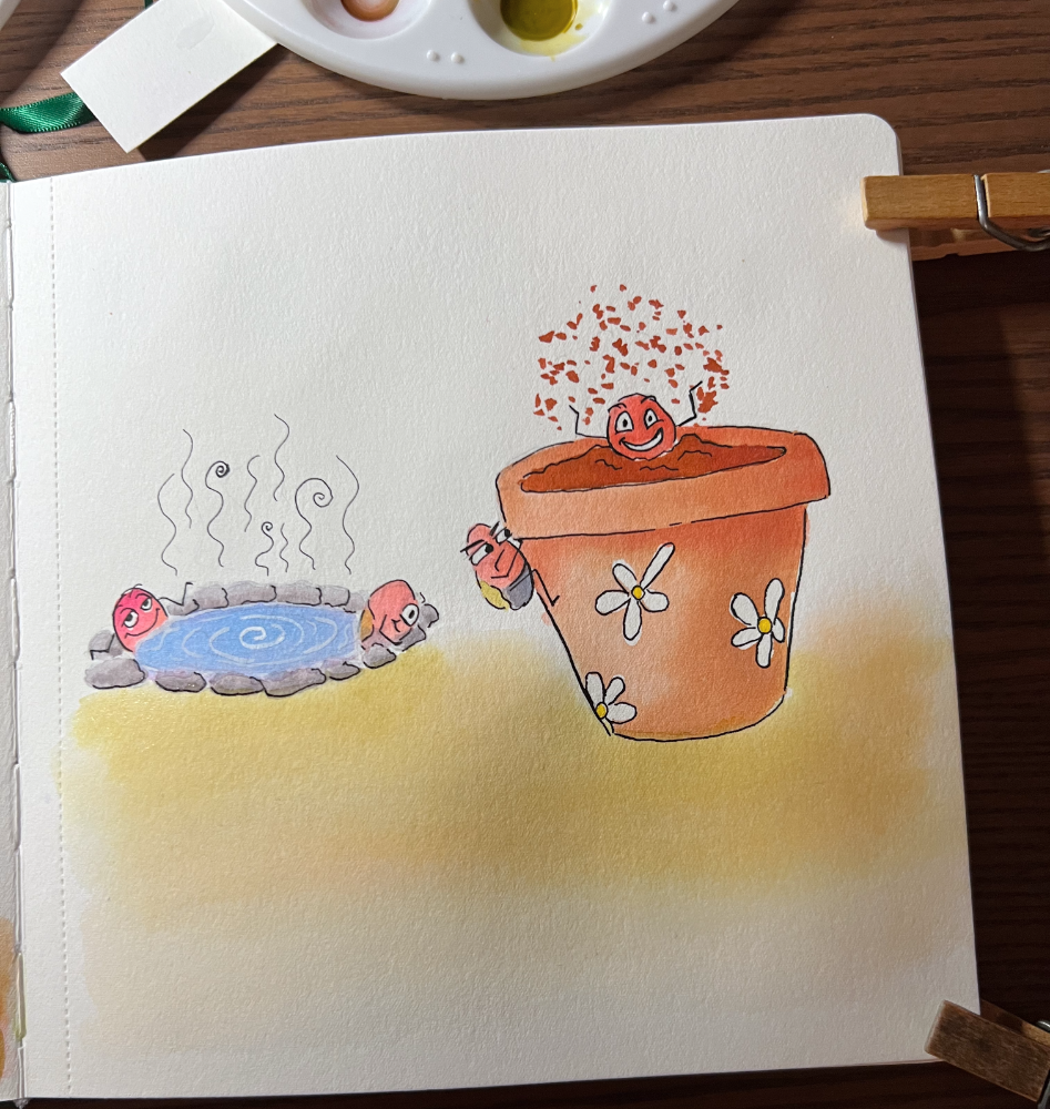 I chose to use the masking fluid for the eyes and mouths, but now I’m thinking I should paint the mouths. I’ll sleep on it and look at it again in the morning.