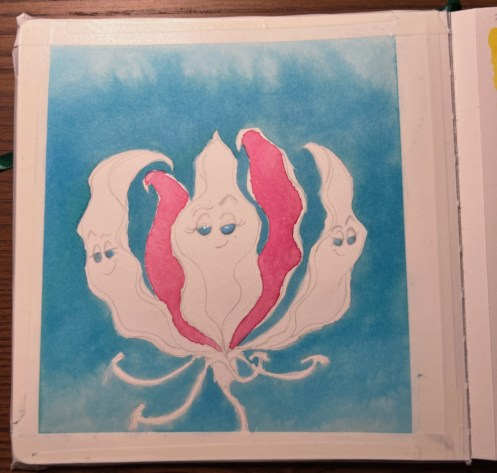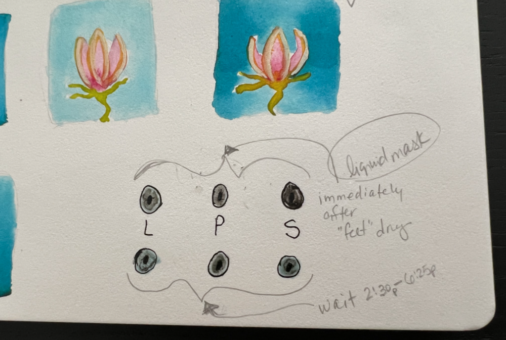 It looked like it would make a giant mess… so instead I decided to put the liquid mask over pencil (blue blobs on the eyes) like I had on a previous project…