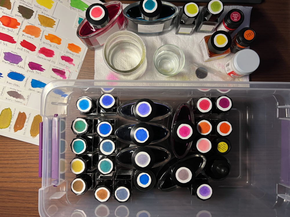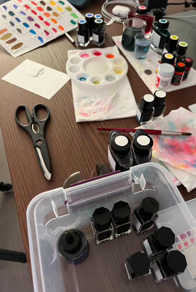 While that dried, I started working on Yesterday’s prompt for Sketchbook Bootcamp, but then I needed an orange and I couldn’t find it because all the lids to my liquid ink are black… and I got side tracked with an extra project to swatch little circles and apply them to the lids so that I could figure out which bottle was the one I wanted…