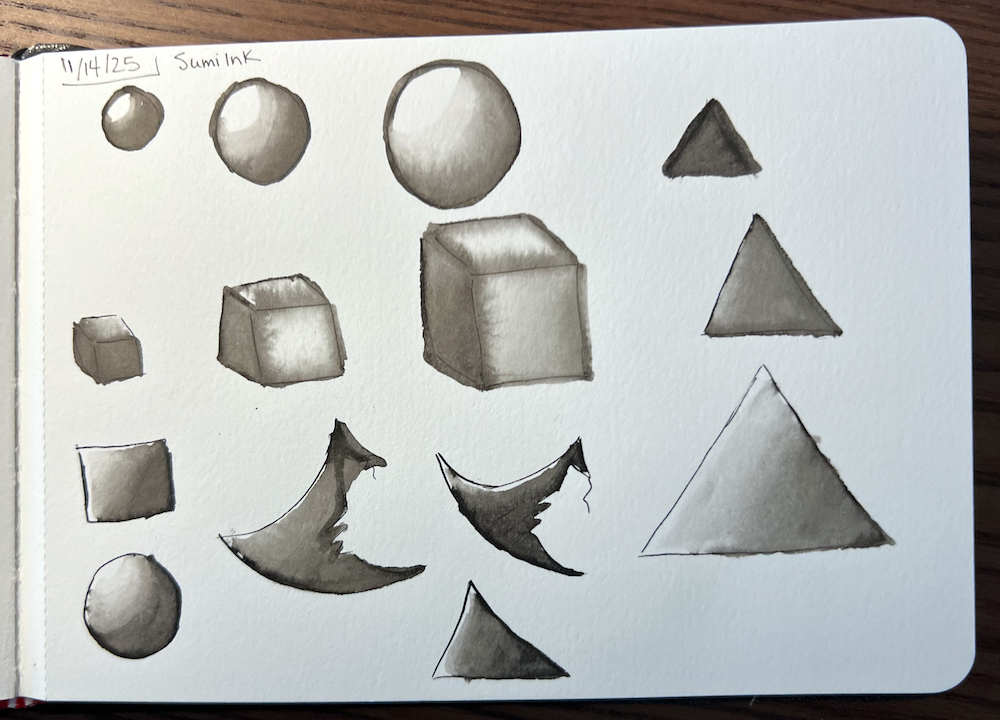 Friday, I thought perhaps I just needed some practice… so I drew some basic shapes and tried to vary the amount of ink that got wet so that I might be able to control it better…