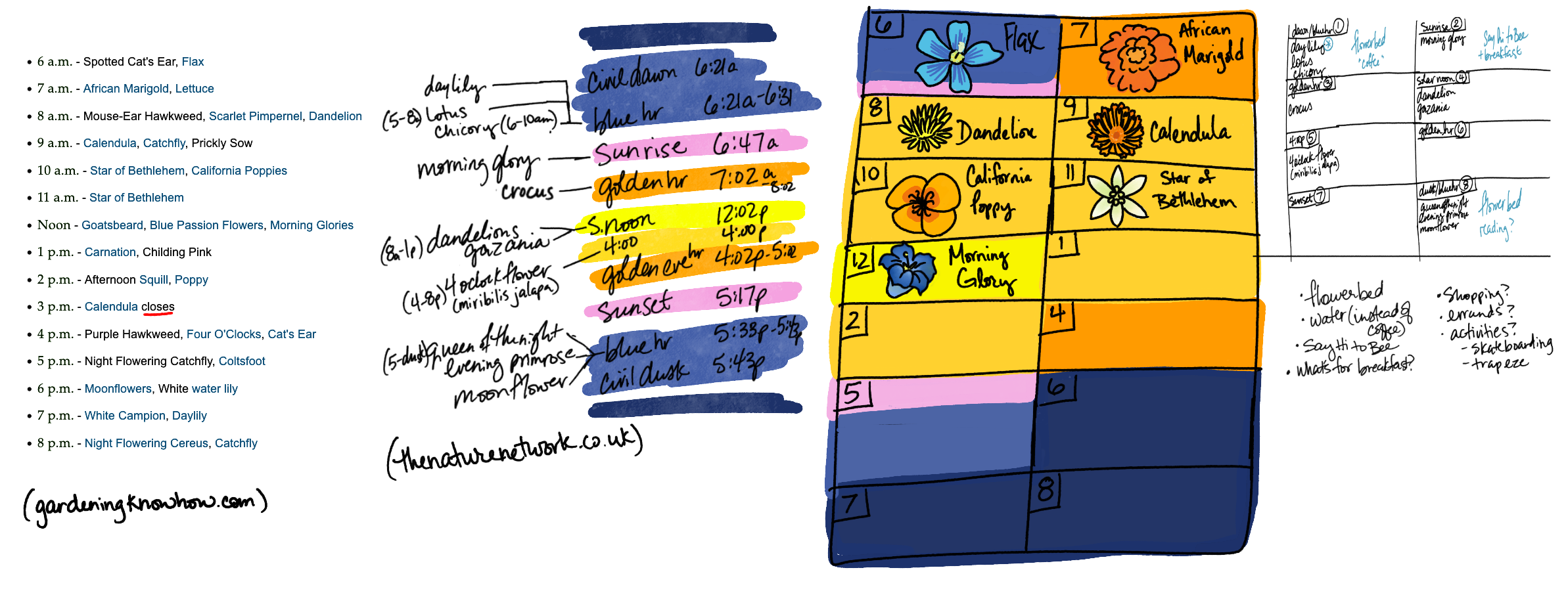 I thought, I really should draw something today, and I didn’t really know where I was going with all this research. So I started drawing some of the flowers that bloomed at a specific times of day… and before I knew it, it was time to go have dinner.