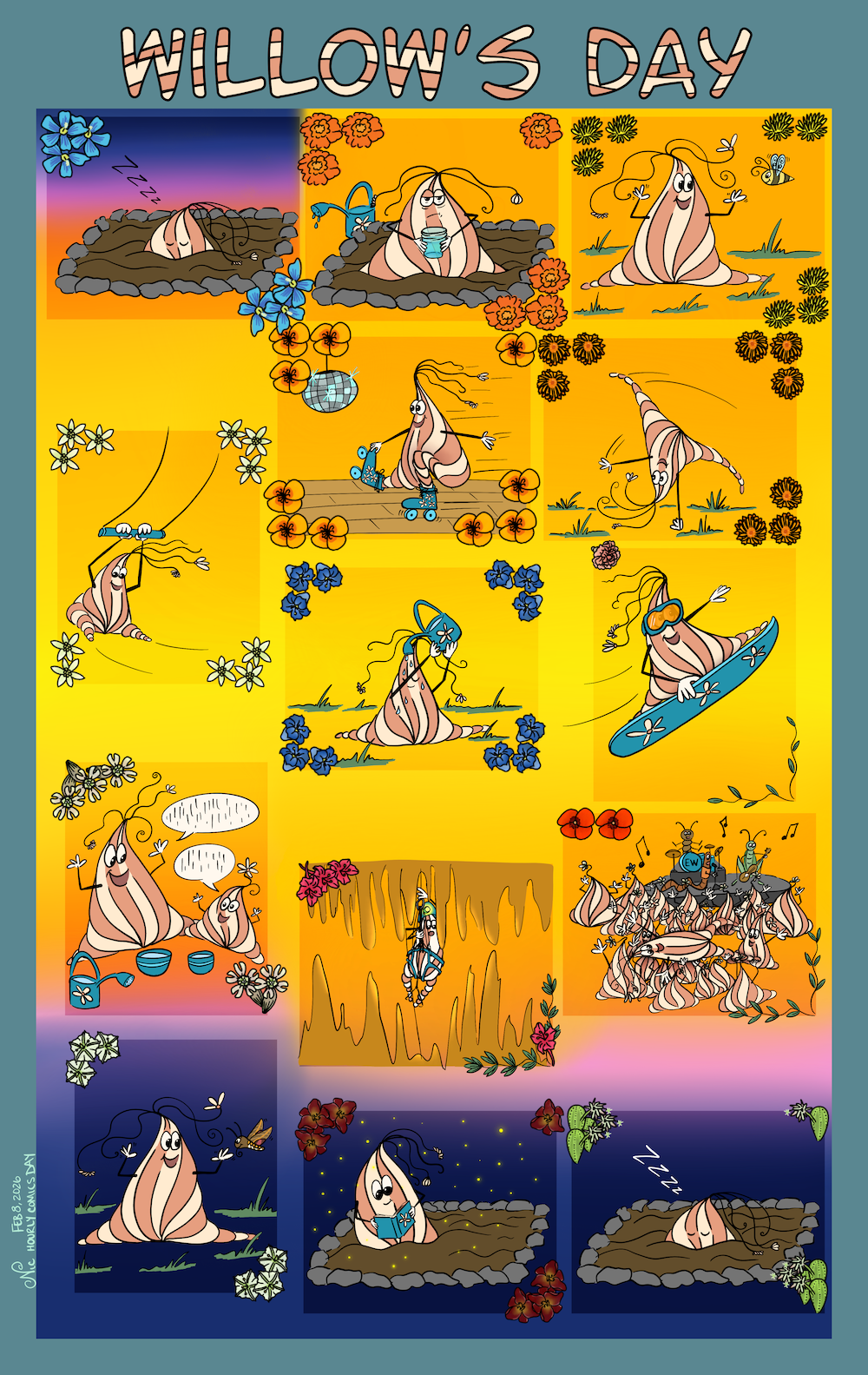 I’m really glad I decided to do this year’s Hourly Comic Day, in a way that was fun for me. Normally you would post hourly the comic/panel… but that is just too much pressure for me at my current skillset. I gathered ideas and sketched out my ideas throughout the week and then inked/painted it over two days. It’s one of my most ambitious projects that I’ve actually finished… I am so delighted!