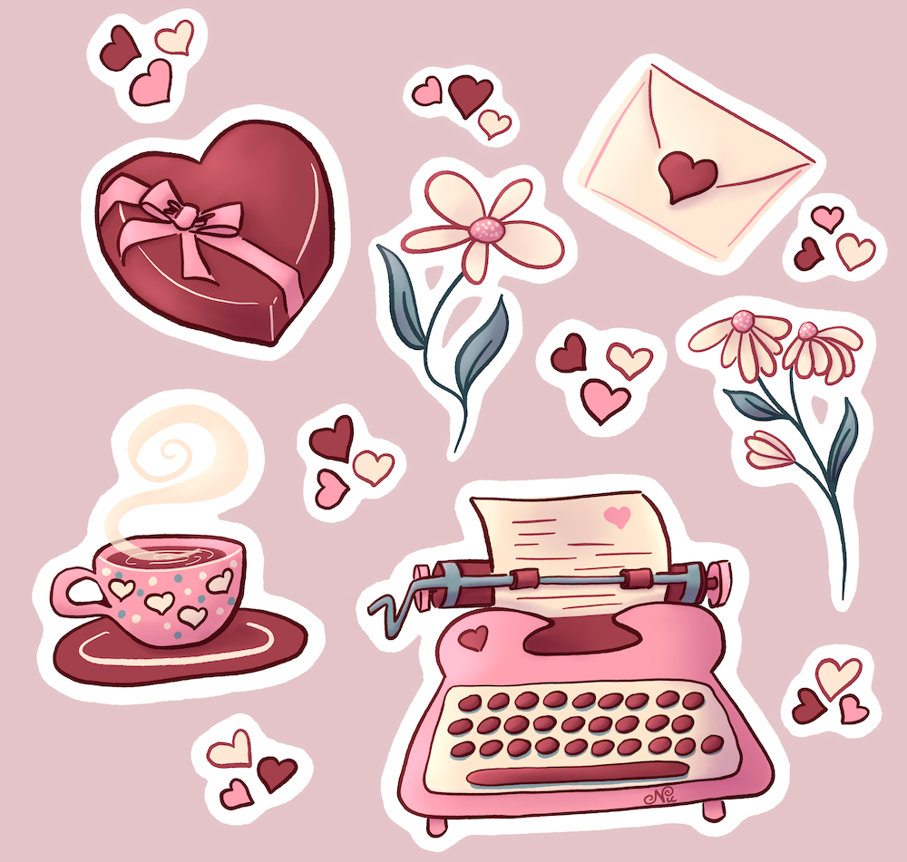 I thought about what would I put in a Valentine’s collection, for me, I would have chosen Daisies instead of Roses, and I wasn’t real happy with my perfume and bow, so I decided to do a box of chocolates, also I didn’t like my stamp – so I changed it to an envelope. Also I wanted to look at reference for the typewriter. This was my first attempt…