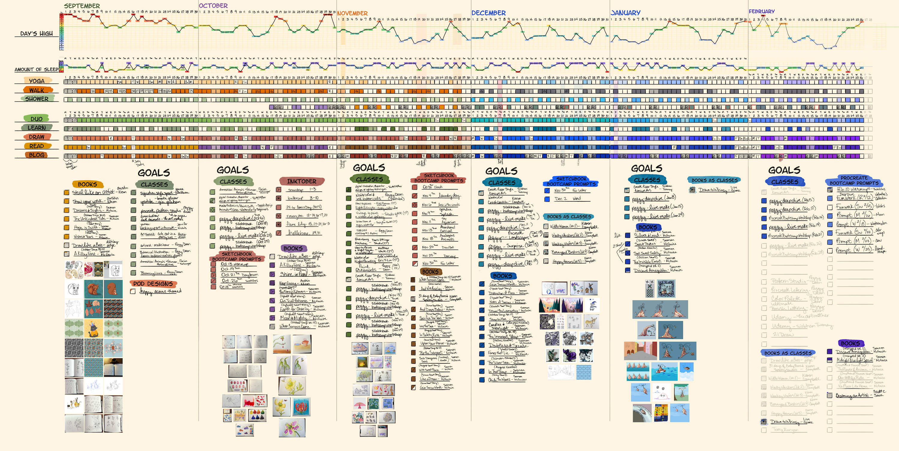 One of my Art Nest friends is doing a 100 day project with the highs and lows of each day… it reminded me that I have been keeping track of our highs and of how much sleep I’ve been getting, along with the streaks of my various dailies. Then I realized that I’ve been drawing nearly daily for almost 6 months! Mind blown! So I spent way too long creating this little graph of the 6 months of data…