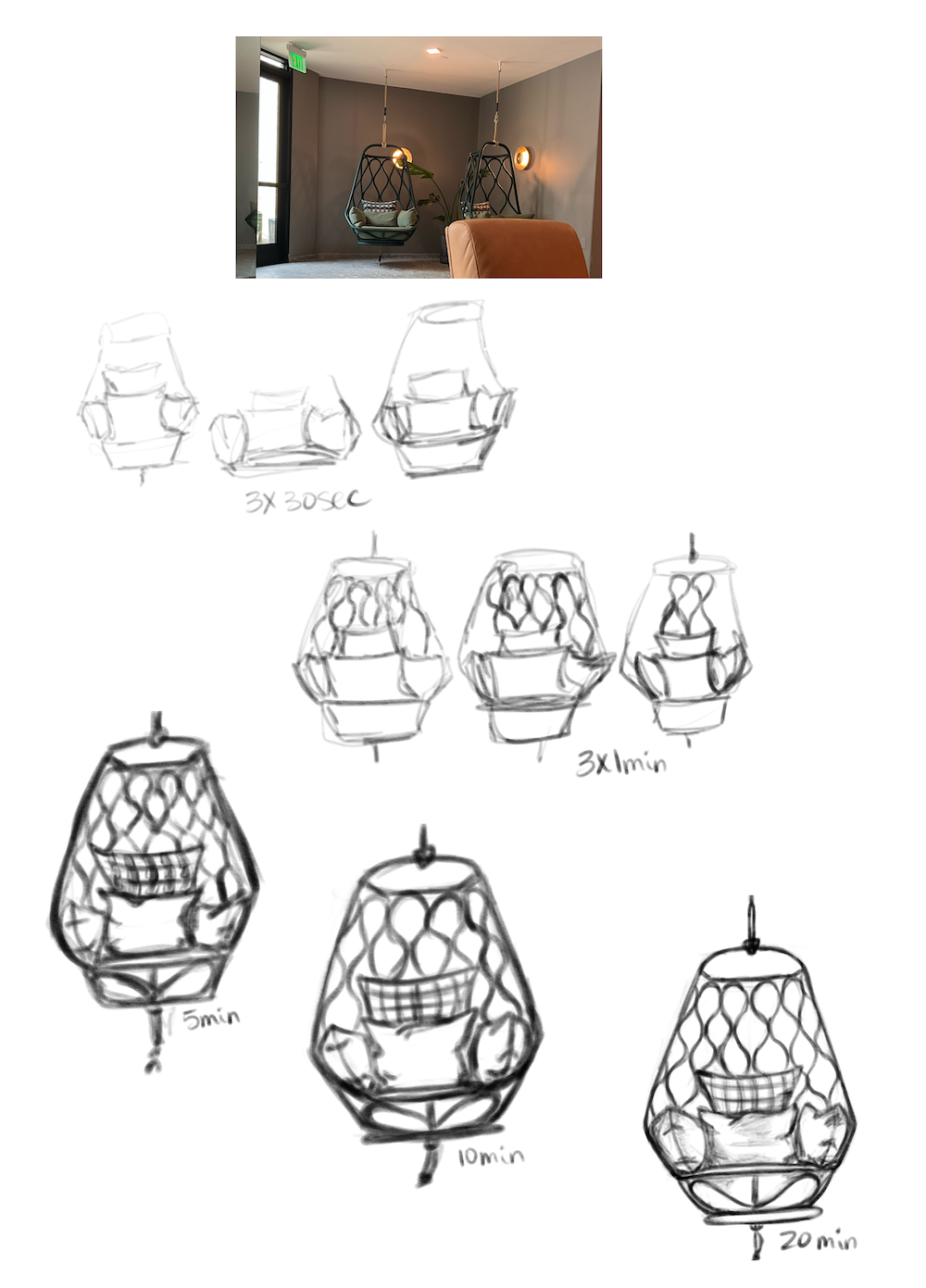 We have these fun hanging chairs in our common area, I thought I’d draw it. I set a timer and drew for 30 seconds three times, then 1 minute 3 times, 5 minutes, 10 minutes, and then 20 minutes. It was a nice session…