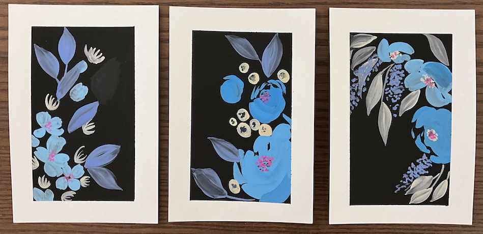 I will be the first to admit that gouache is just something I’m not great at… that’s why I was taking the class! Plus it was with Peggy, so I knew I’d enjoy myself. 🙂 I was using water-based gouache and well, it reactivates with water. So even though the black paint was dry when I applied the blues and creams it would pick up the black it I made additional strokes. It is definitely a learning curve, I will have to find some time to practice… but this is what I was able to do in class…