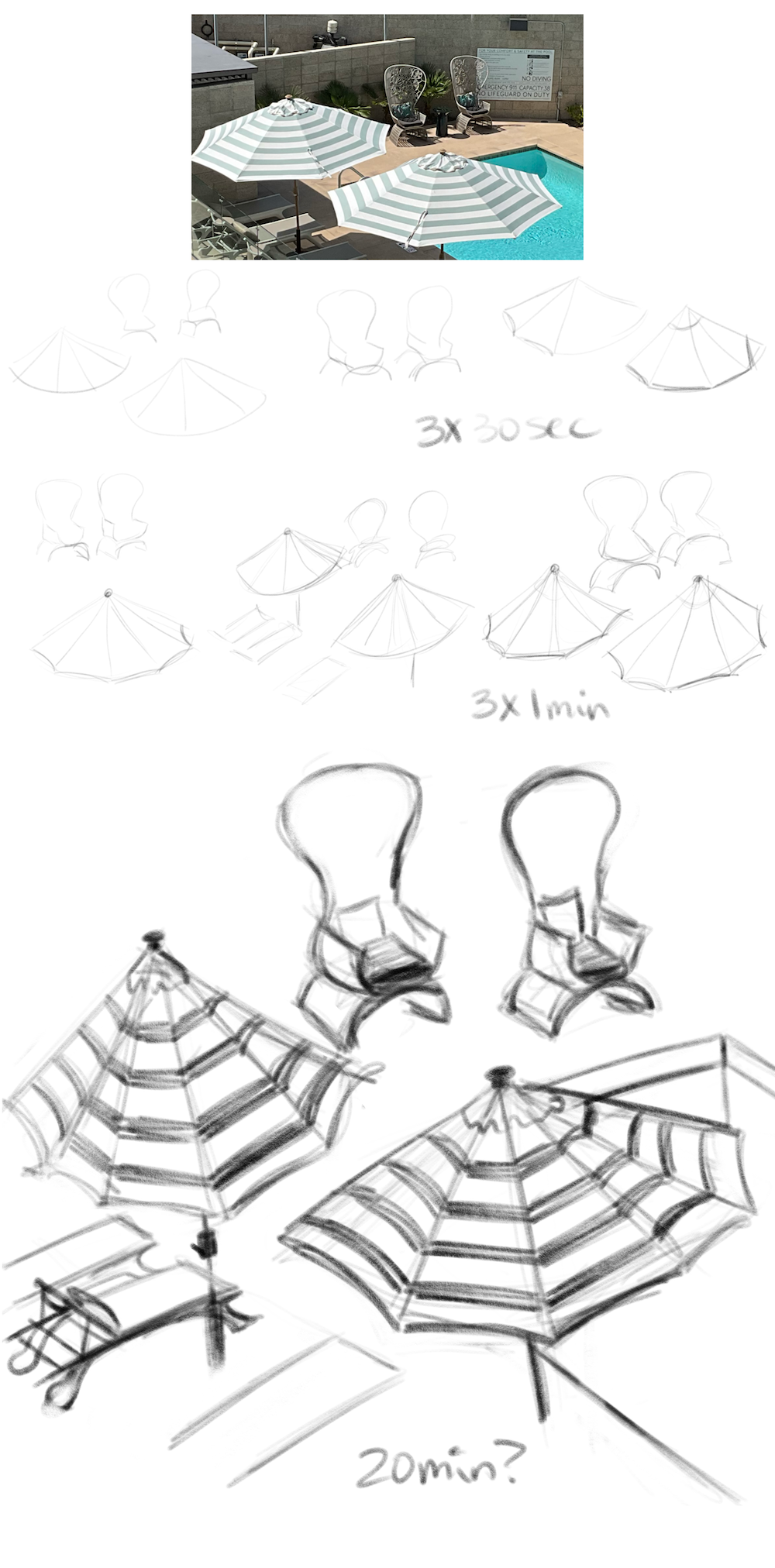 It is just too darn hot today to do an IRL sketch today, SoCal is in a heat wave. So I took this photo of the pool, because I thought those curvy chairs looked neat. I did three 30 second sketches… then my watch required charging… so I set the timer to do three 1 minute sketches. I set the timer for a 5 min sketch and it never went off… so I worked on the last sketch for some time, perhaps 20 minutes? …