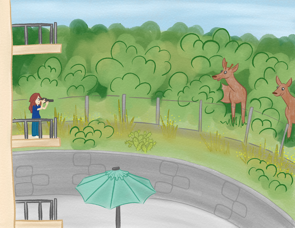 But first, I want to show a drawing I’ve been working on for a few days, it’s for Procreate Bootcamp Prompt #12 – slice of life. I saw some deer from my apartment balcony a few days back, so I drew the encounter.