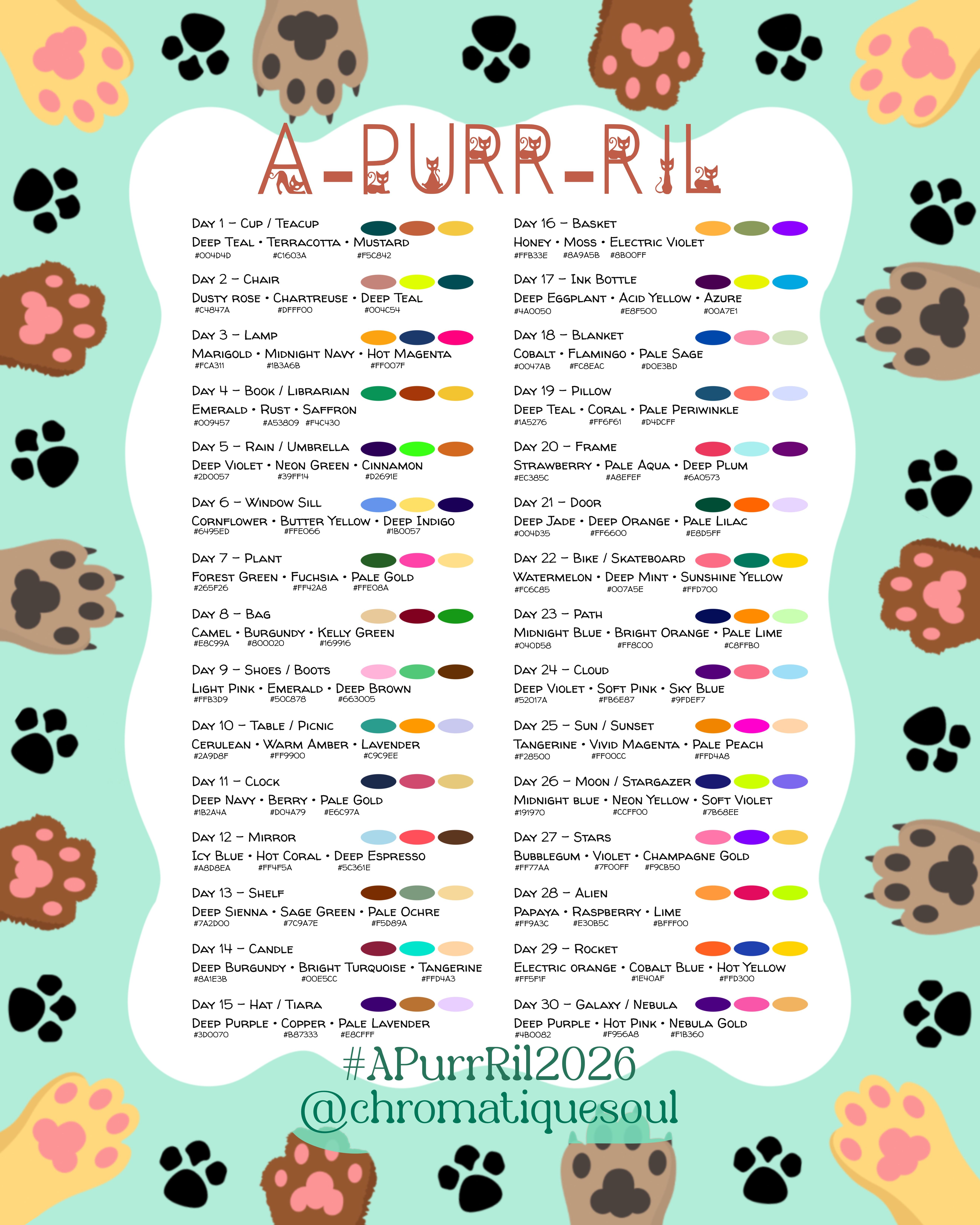 I’ve been working behind the scenes with my friend Leslie in ArtNest. She enjoyed her Catober so much that she wanted to do it again before October. So we did some brainstorming and came up with A-Purr-Ril… a month of cat drawings… we come up with prompts and color palettes for each of the 30 days of April. Will you join? You can see her IG here. Here’s the prompt list if you’d like to join.