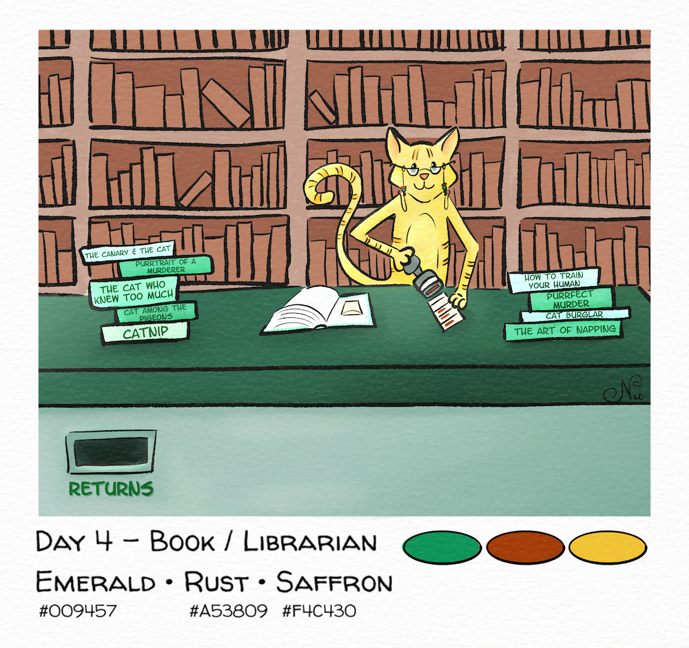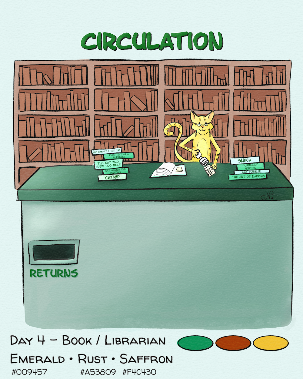 I had fun creating this one. I used to work in a library a million years ago so this one was dear to my heart. I thought I had finished this last night, but today with fresh eyes I realized that 1. I forgot to add shadows/highlights, but more importantly 2. I had some extraneous information in the drawing that took away from all the detail in the cat and the books. So I deleted the extra stuff and I like it much better now.