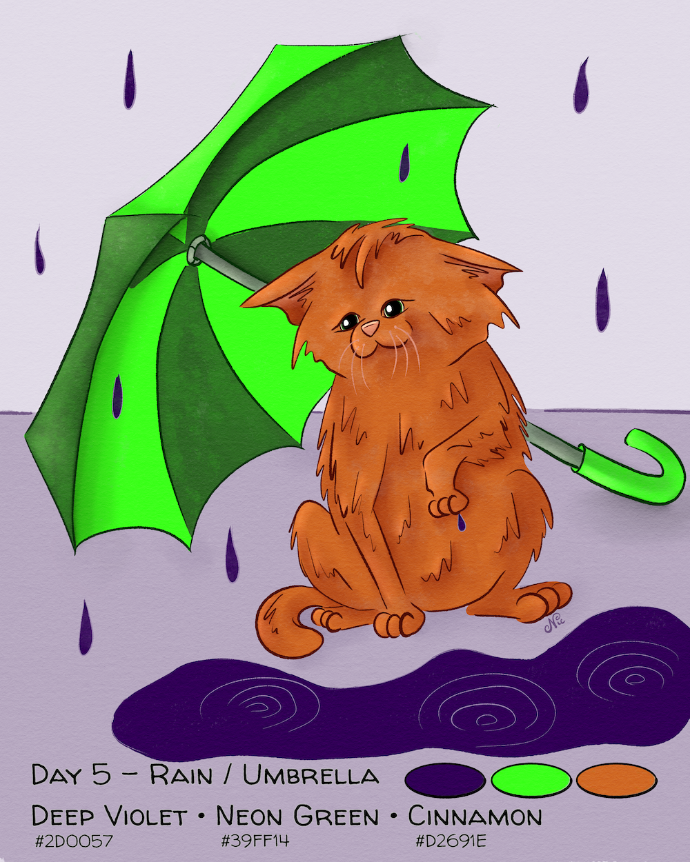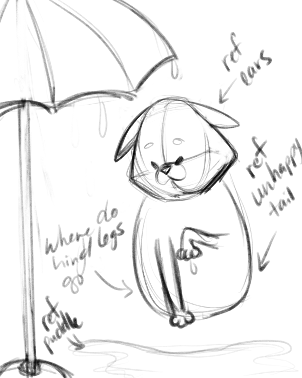 Here’s the drawing in the sketch phase… I needed to look up some reference to figure out the hind legs, the flattened ears, and the tail. I also needed to figure out the puddle, and decided on a different umbrella…
