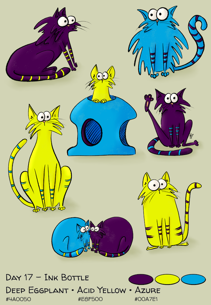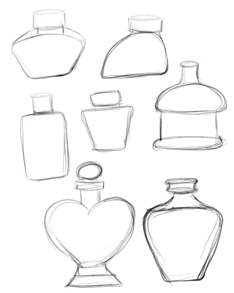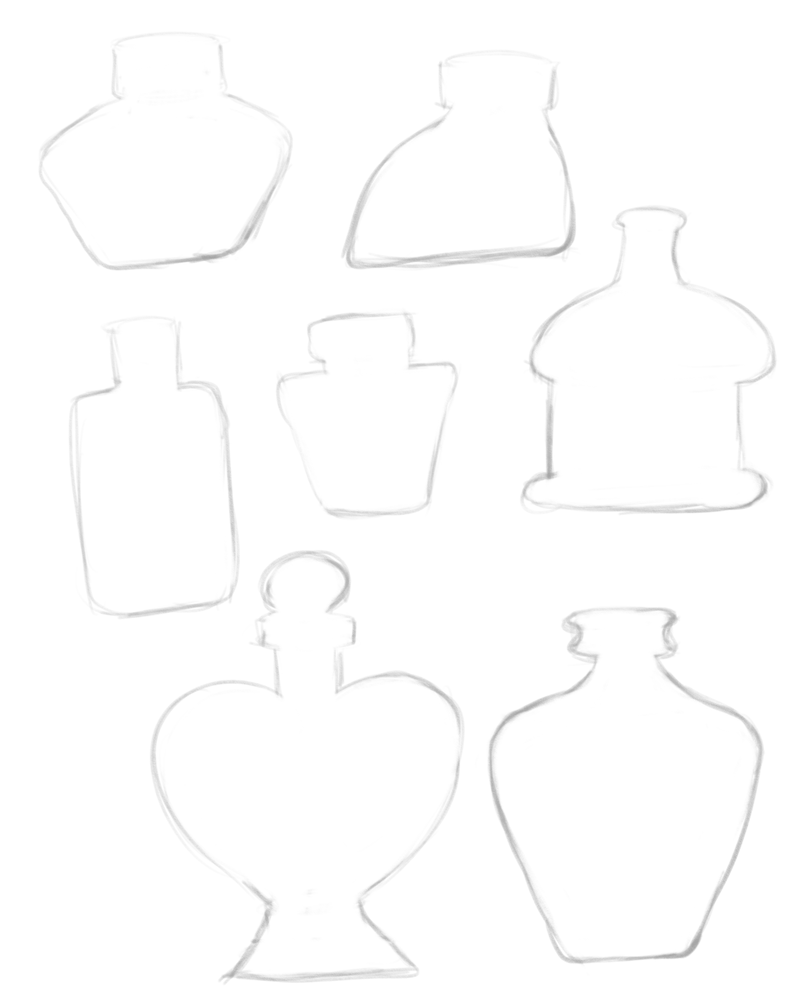 While I was drawing Stanley, it occurred to me that the rectangle shape was like an ink bottle. Then I thought, ‘what if I used the shape of ink bottles as the ‘blob’ for some cats?’ So I looked up some ink bottle shapes that I liked and drew them, then I removed the interior lines to make them ‘blobs’…